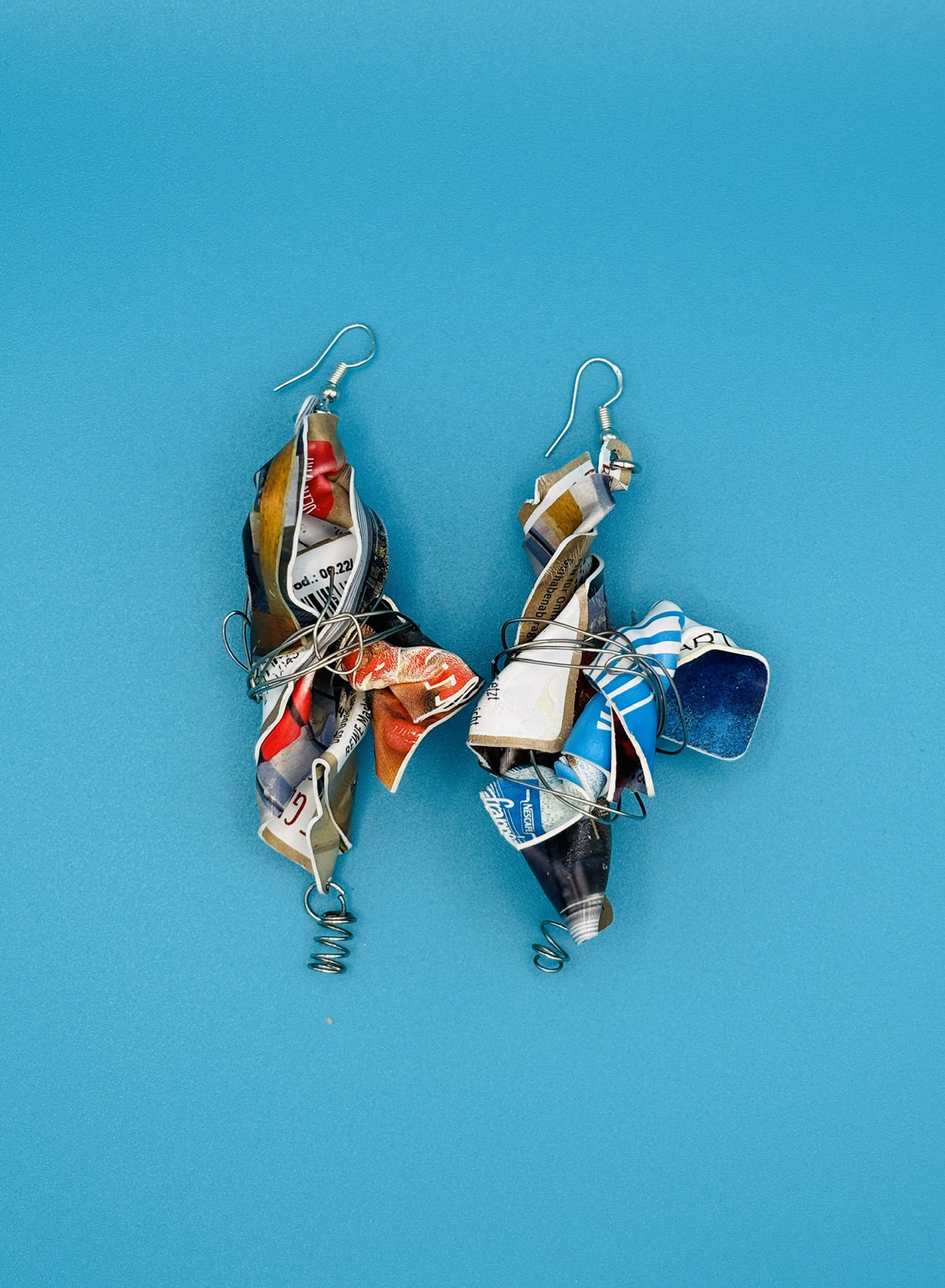 Handmade up-cycle Wearable Art earrings. They are bold, fun, and elegant. Light in weight.