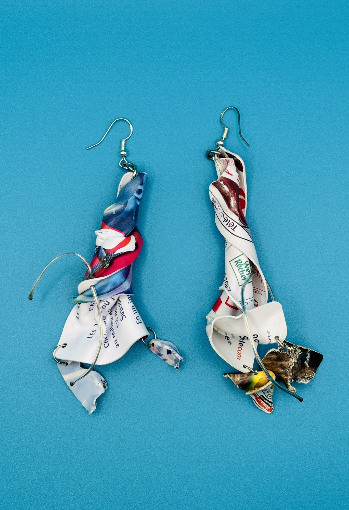 Handmade up-cycle Wearable Art earrings. They are bold, fun, and elegant. Light in weight.