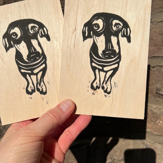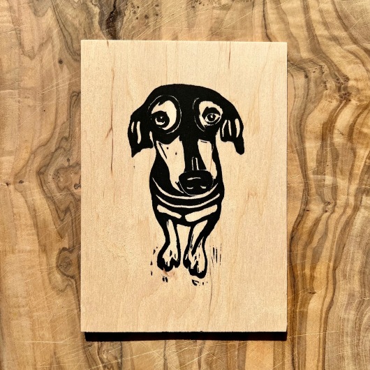 Linoldruck auf Birkenholz 3 mm , Kleiner Hund, Hundi, petit chien, Dachshund, little dog