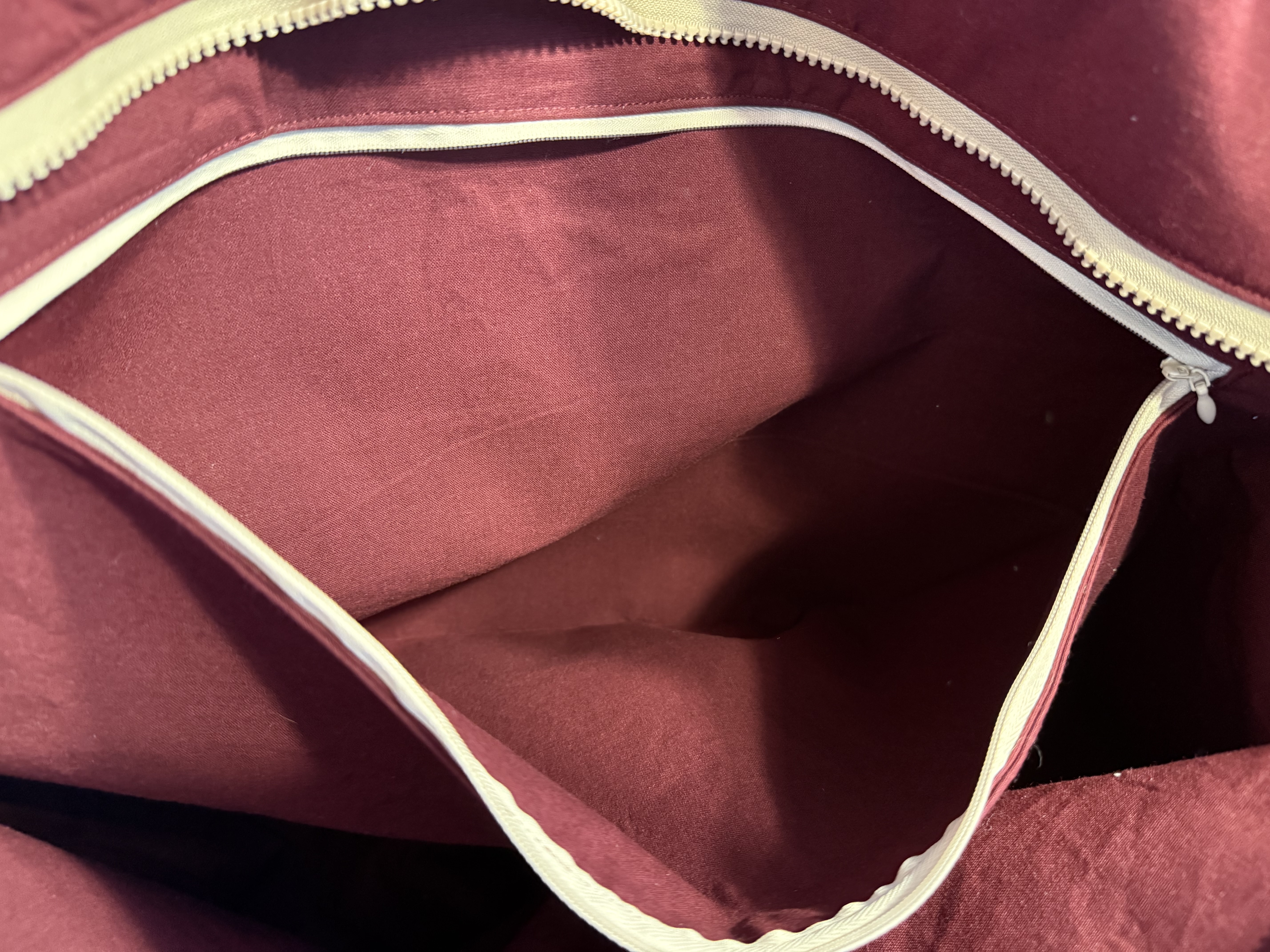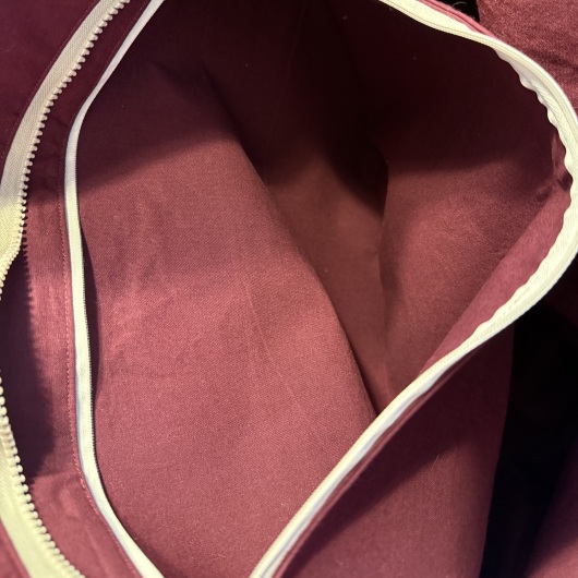 Aus sehr strapazierfähigem Gobelinstoff, mit dunkelrotem Innenstoff aus Baumwolle. Robuster Reißverschluss und eine Innentasche, die ebenfalls per Reißverschluss geschlossen werden kann.