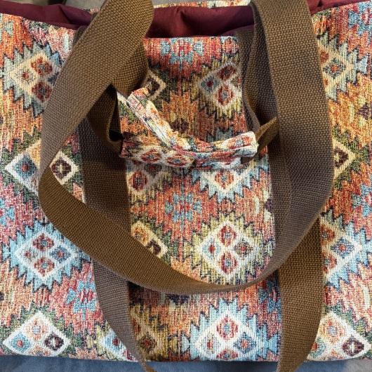 Maße der Tasche: unten 48cm breit, oben 60cm breit, Träger 96cm Länge von Befestigung zu Befestigung.