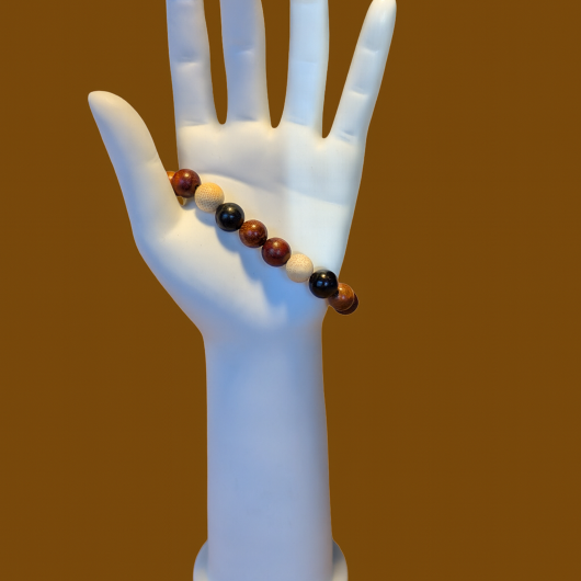 Dieses handgefertigte Armband (passende Halskette ebenfalls im Shop) aus polierten Rosenholzperlen vereint natürliche Schönheit mit stilvoller Schlichtheit. Die Perlen in Braun, Schwarz und Weiß sind auf einem robusten, dunklen Band arrangiert und ergeben ein harmonisches Farbspiel. Mit einem Umfang von ca. 20 cm passt es bequem ums Handgelenk.