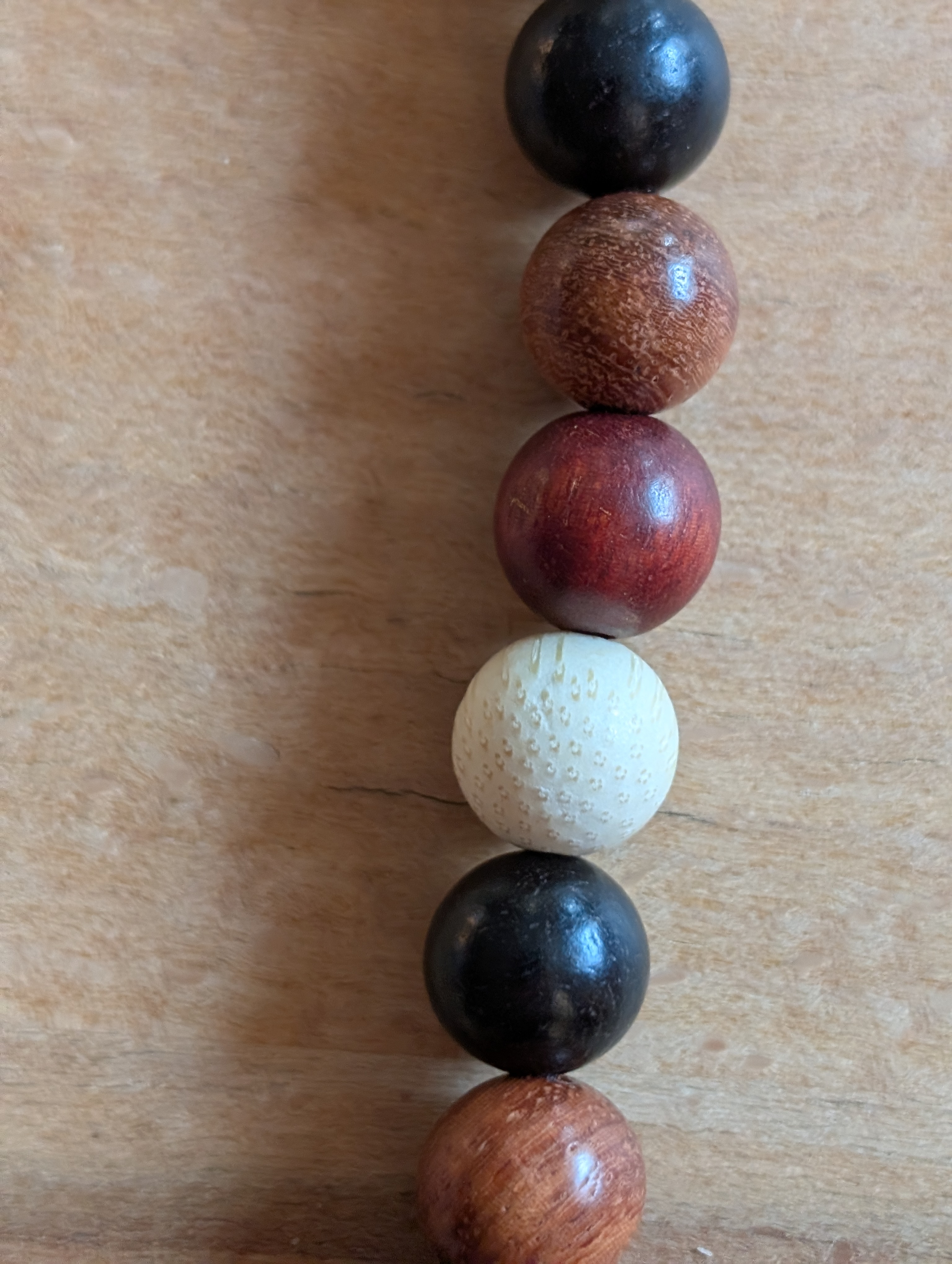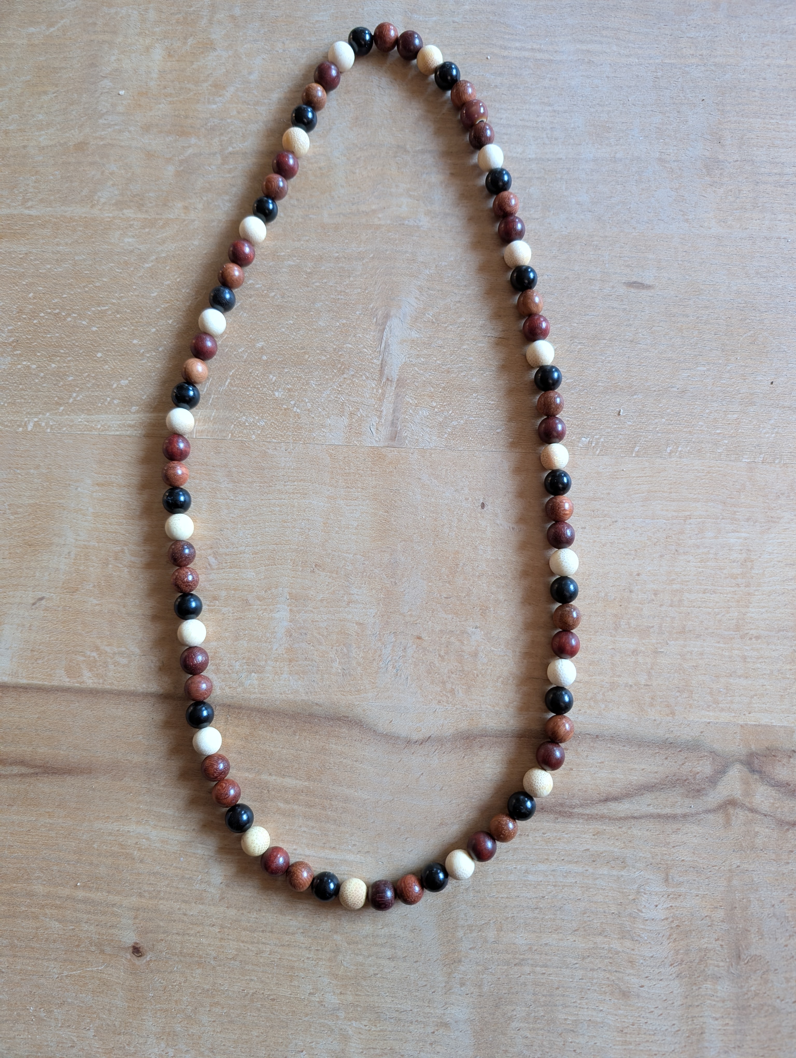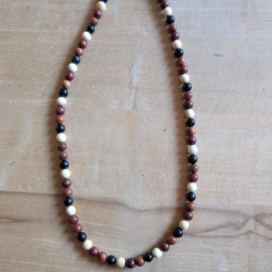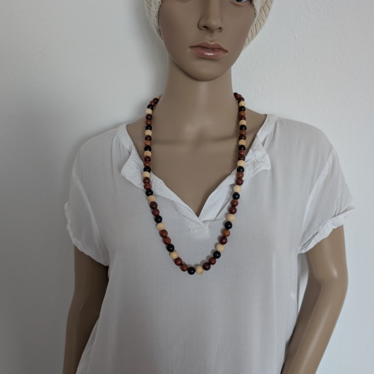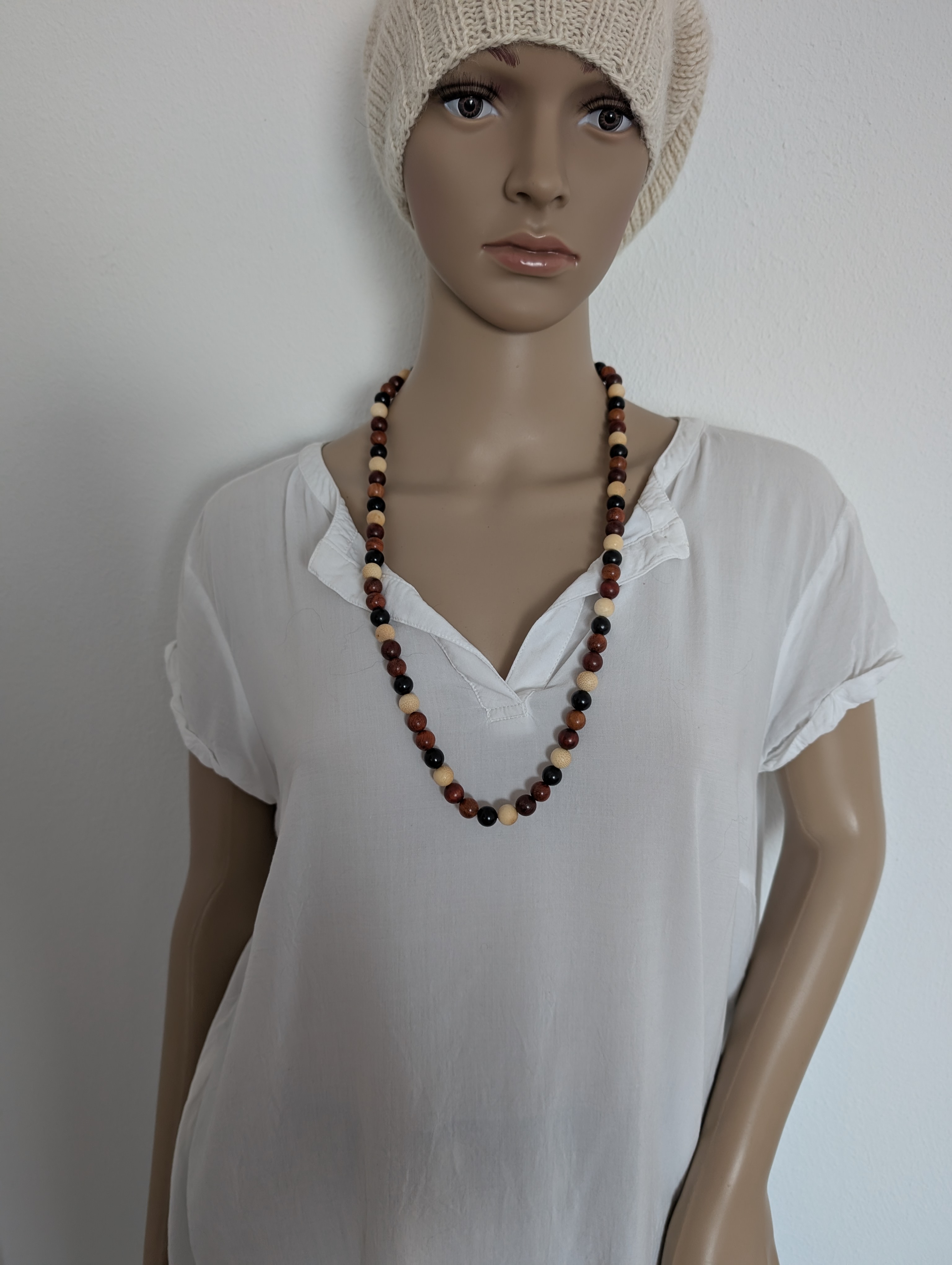 Diese handgefertigte Halskette aus polierten Rosenholzperlen vereint natürliche Eleganz mit einem klaren, zeitlosen Design. Die Perlen in Braun, Schwarz und Weiß sind in einem harmonischen Muster arrangiert und verleihen der Kette eine stilvolle Ausstrahlung.
