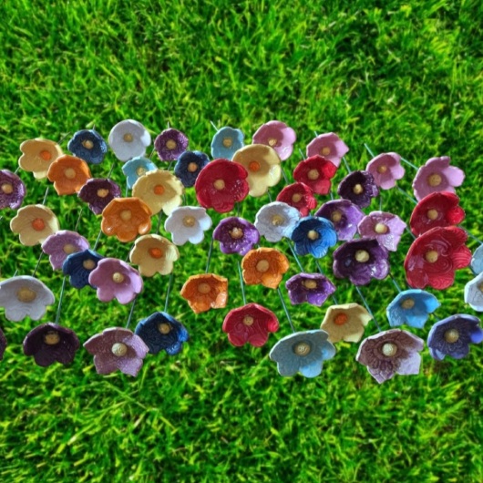 Insekten- / Bienentränken in Form von Blumen - und jetzt ganz neu in Form von Herzen oder Muscheln - mit ca. 10 cm langen Stängeln (ummantelter/lackierter Draht) zum Einstecken in die Erde - in Beeten, zwischen Blumen, in Balkonkästen etc.