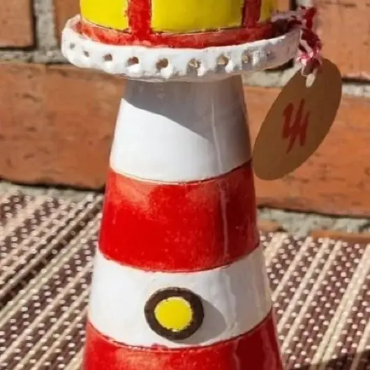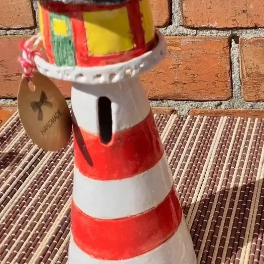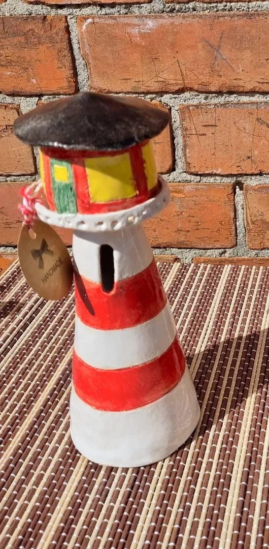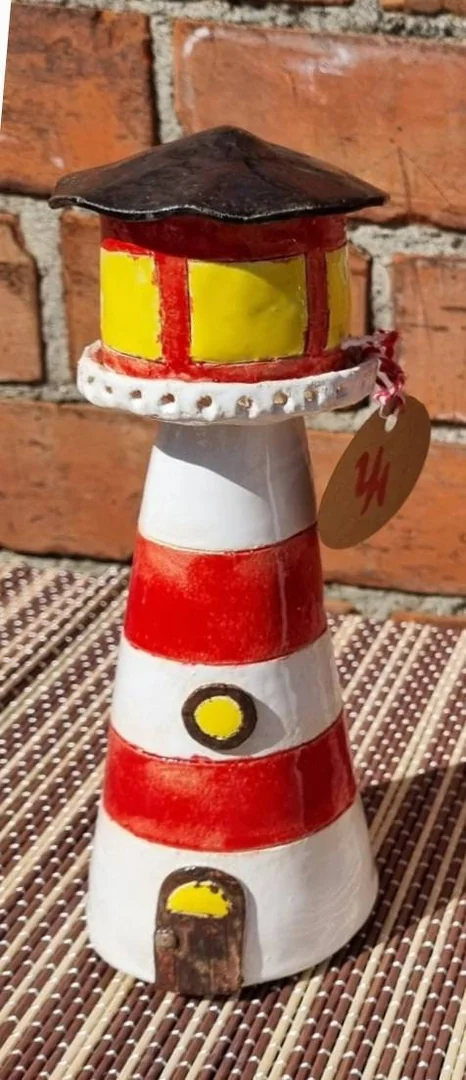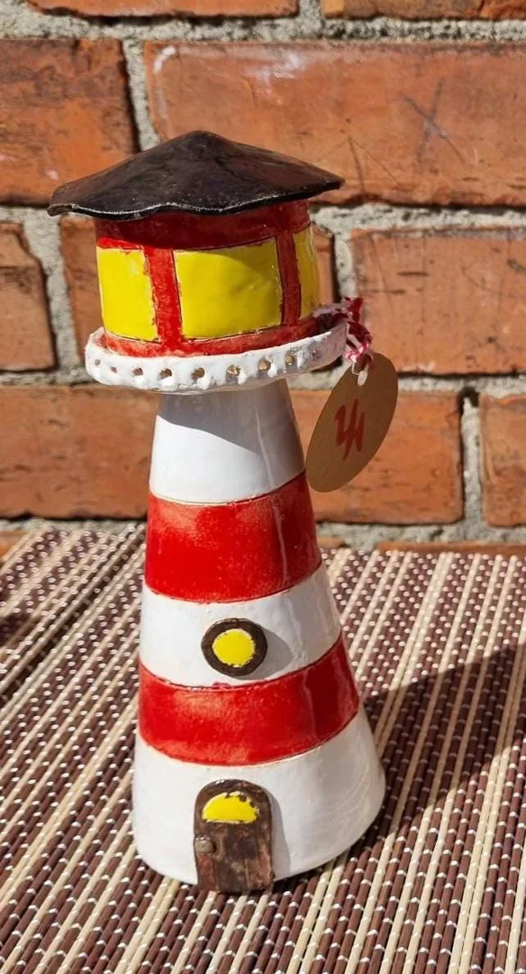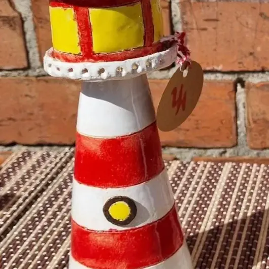 Lighthouse in red and white striped with yellow windows and black roof. 8 x 20 cm