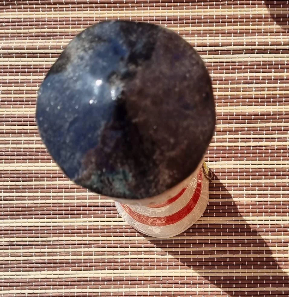 Purely handcrafted (except for the plastic closure). Created from clay in construction work. Glazed and fired 2 times.