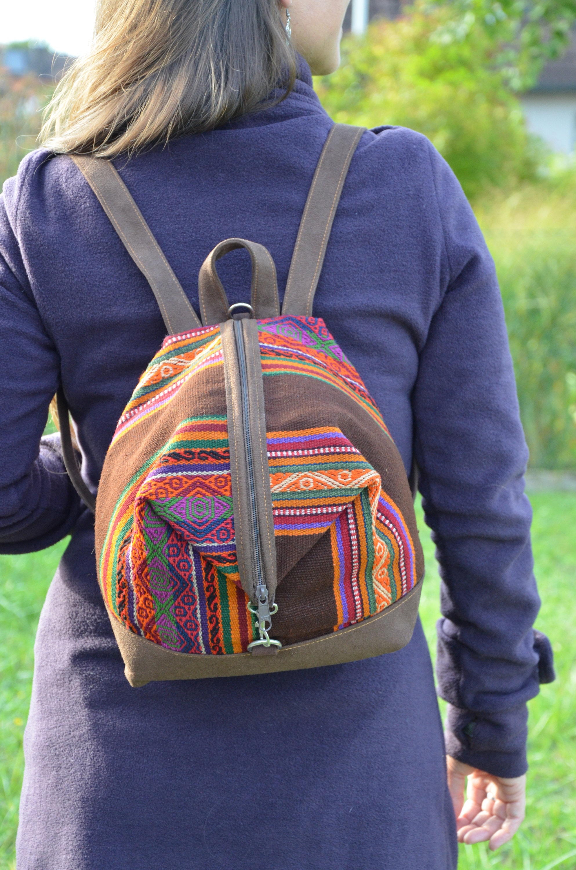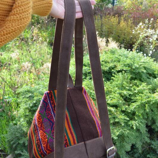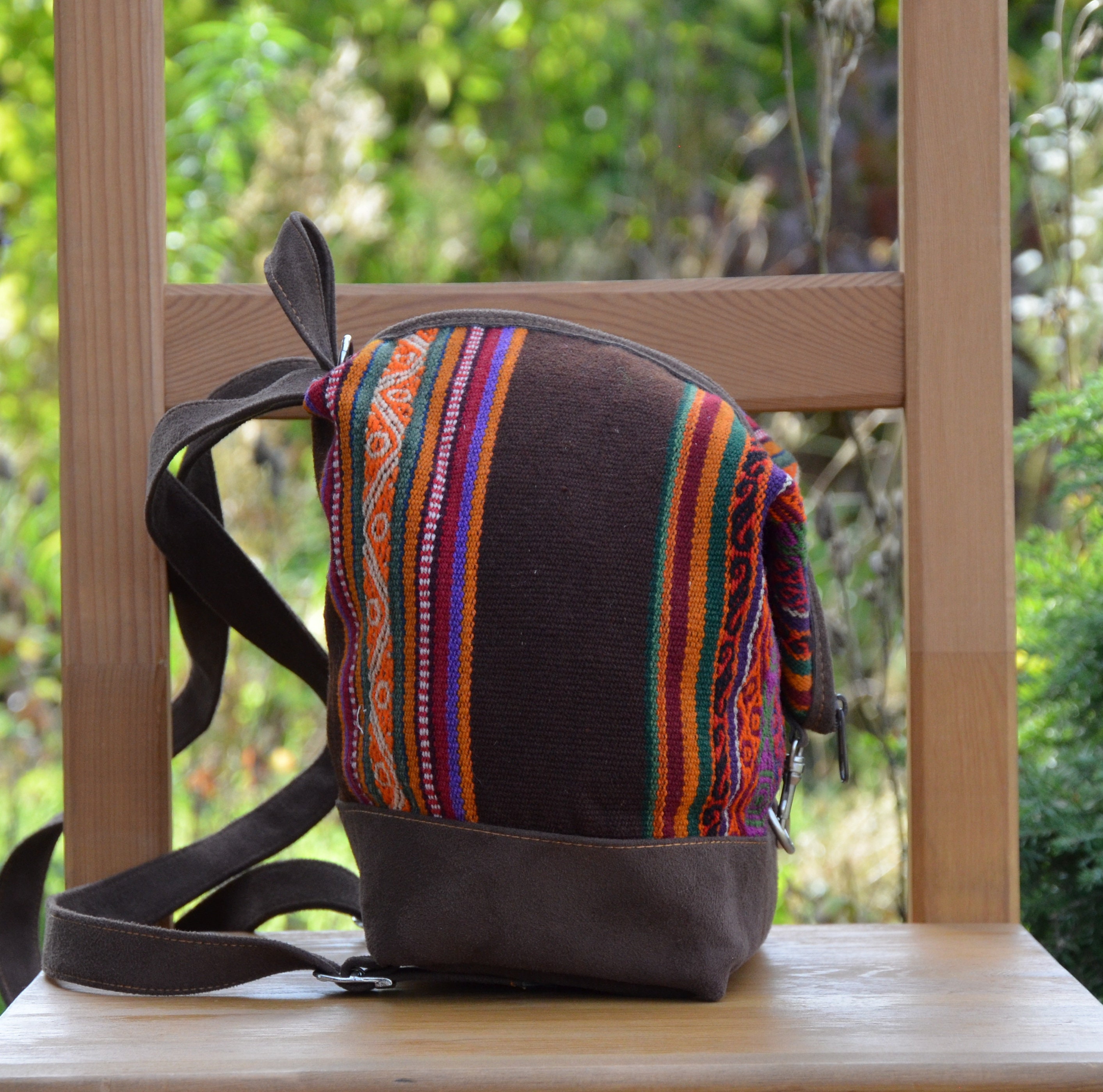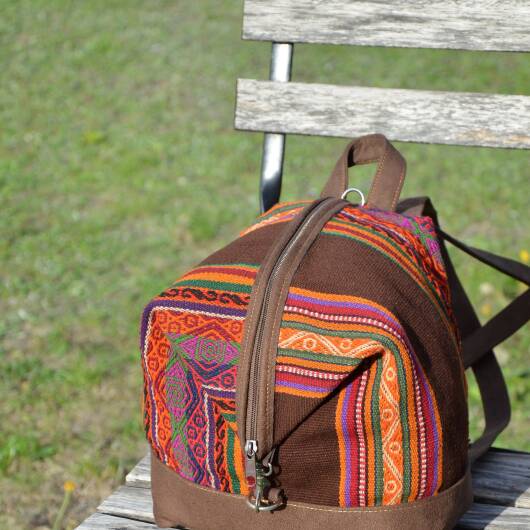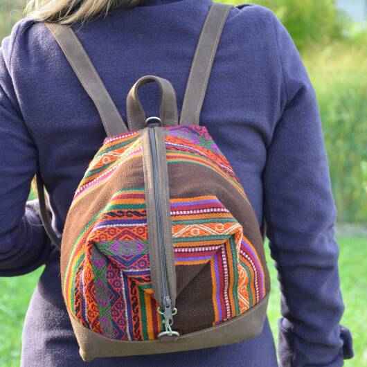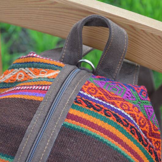 Our unique backpacks are handmade in Peru and are the result of an elegant combination of plain faux suede and naturally dyed and hand-woven sheep's wool from the Cusco region, also known as Manta Cusqueña. The cheerful blaze of colors reflects the traditional textile art of the Andean region as well as the Peruvian joie de vivre!