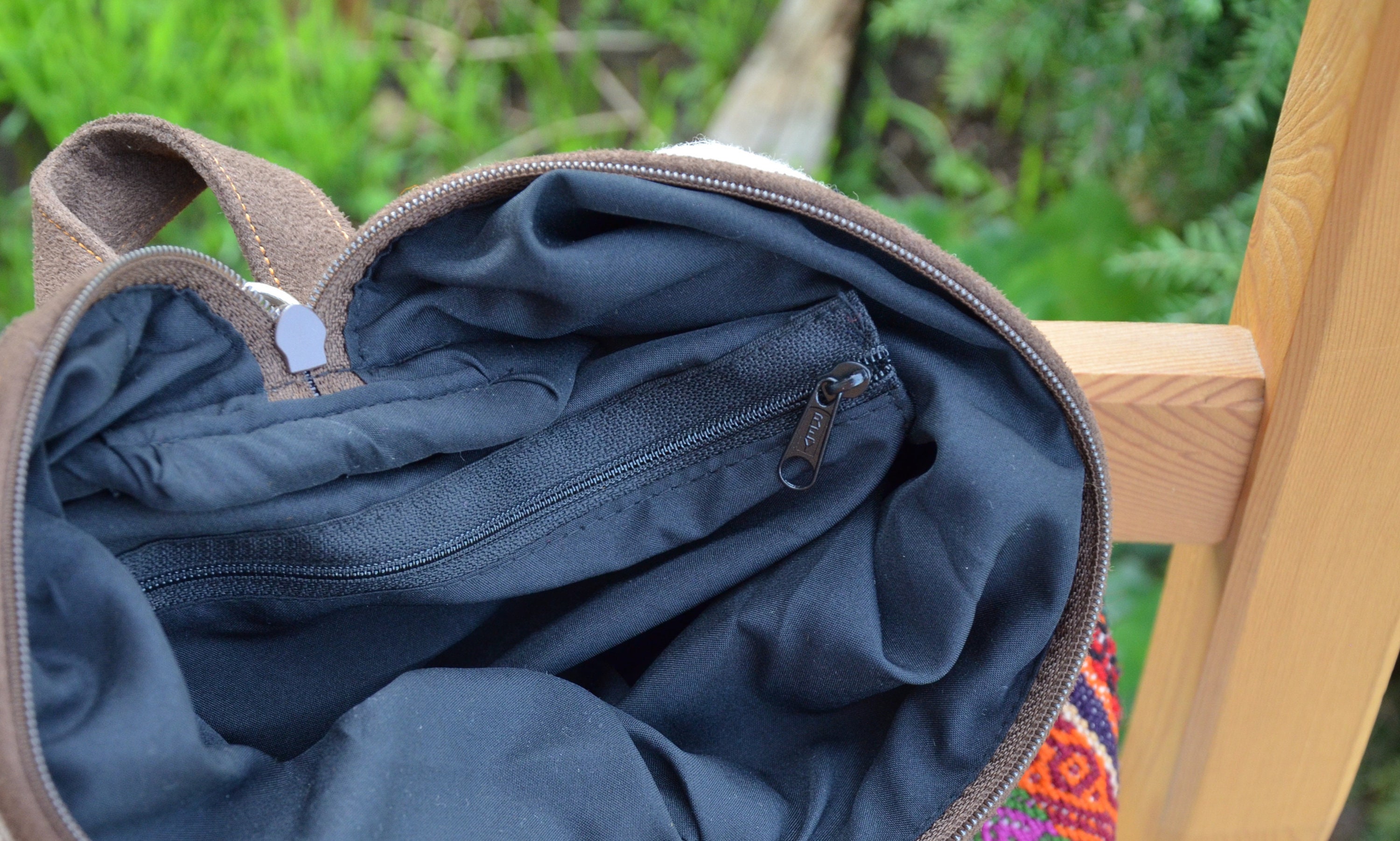 Inside, the backpack is covered with a black cotton fabric and there is also a small inside pocket with zipper for smaller utensils. The two straps are adjustable in length.
