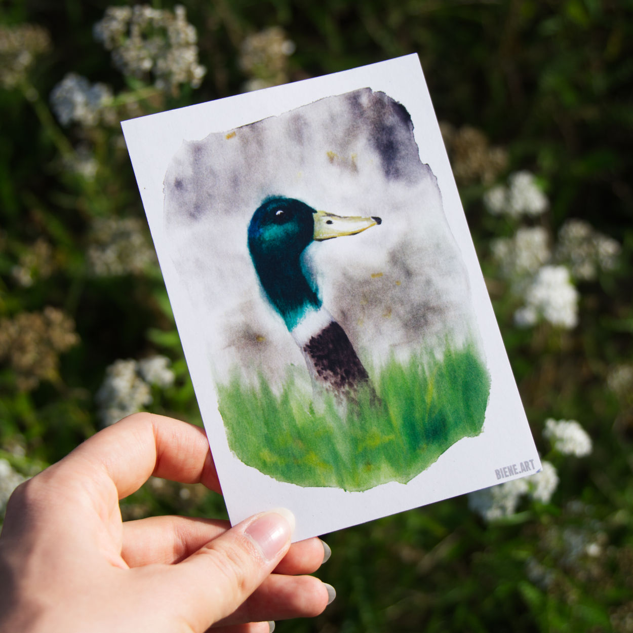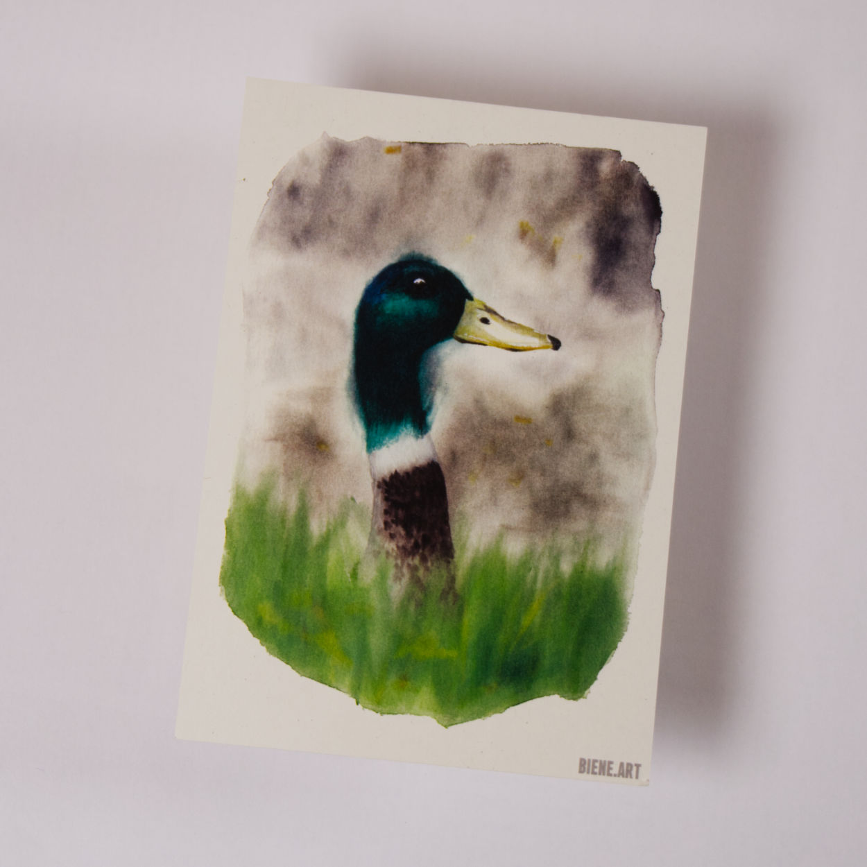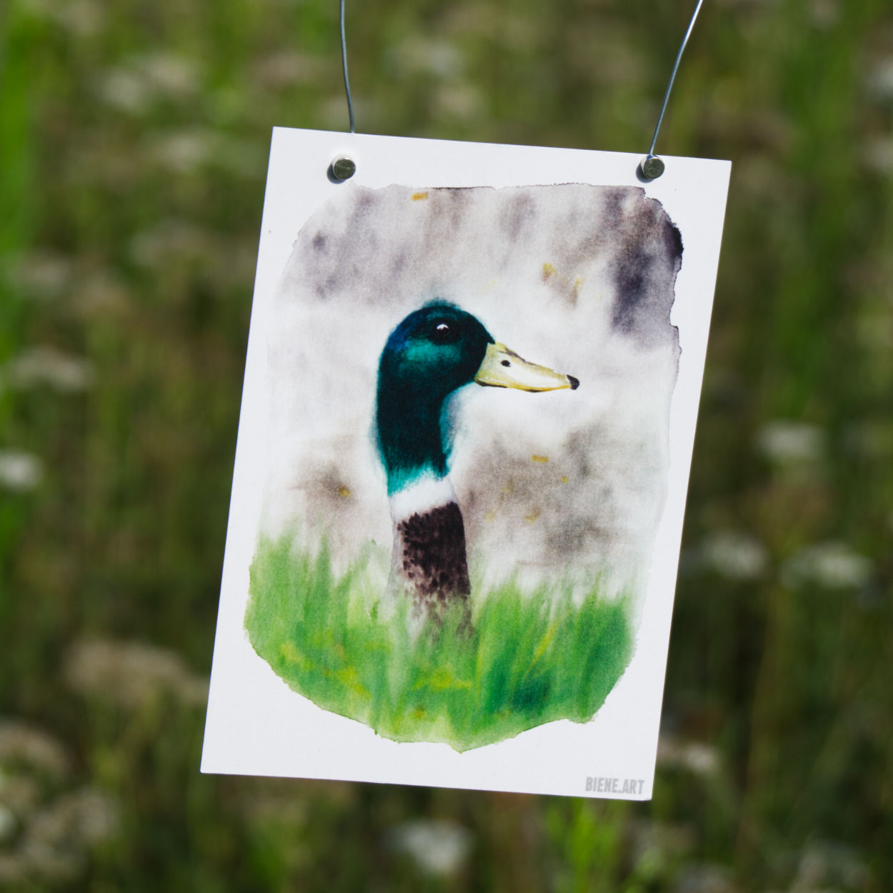 Das Aquarell wurde von mir auf Basis eines Fotos gemalt. Es zeigt eine Ente, welche sich aufmerksam umschaut.