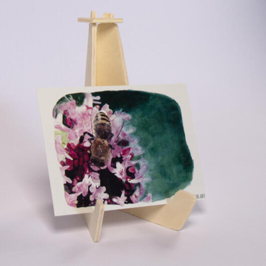 Das Aquarell wurde von mir auf Basis eines Fotos gemalt. Es zeigt eine Honigbiene, welche auf Oregano Nektar und Pollen sammelt.