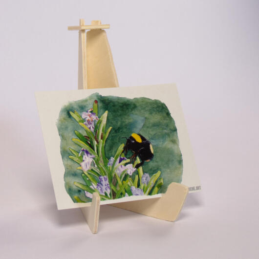 Das Aquarell wurde von mir auf Basis eines Fotos gemalt. Es zeigt eine Hummel, welche auf Rosmarin Nektar und Pollen sammelt.