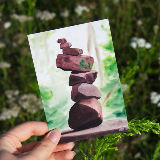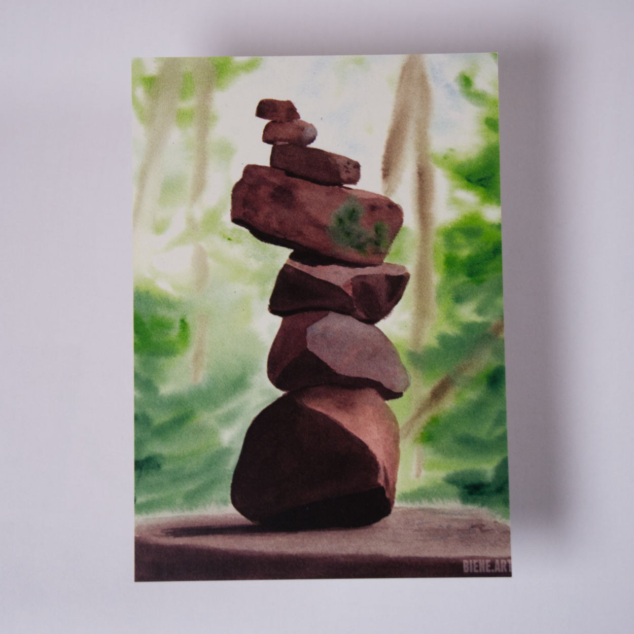 Das Aquarell wurde von mir nach der Inspiration eines Waldspaziergangs gemalt. Der Steinstapel besteht aus Sandstein, ein sehr häufiges Material im Pfälzerwald.