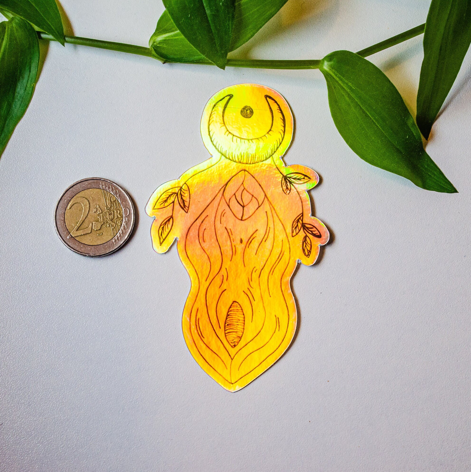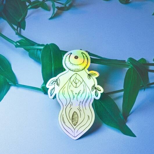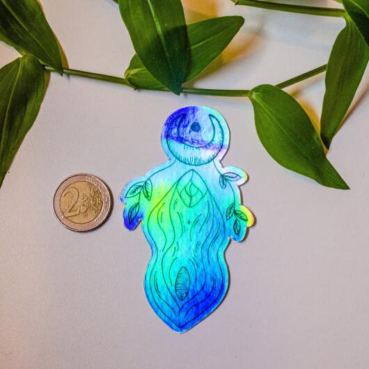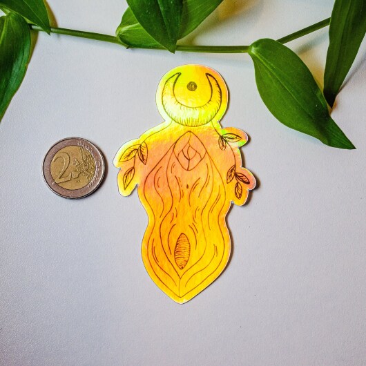 Celebrate celestial energy, feminine strength, and body positivity with this stunning Holographic Moon Vulva Sticker. Designed to honor natural anatomy through a symbolic lunar motif, this sticker shimmers with rainbow reflections as it catches the light. Perfect for artists, activists, and anyone who loves expressive, empowering art. The sticker is perfect to personalize your laptop, smartphone, fridge and any other object – the possibilities are virtually endless. If you are looking for a present for a feminist, whether it‘s a friend, family member or even yourself, this sticker is the perfect choice! You can use it as birthday gift, for Valentine‘s Day or Christmas, it‘s always empowering.