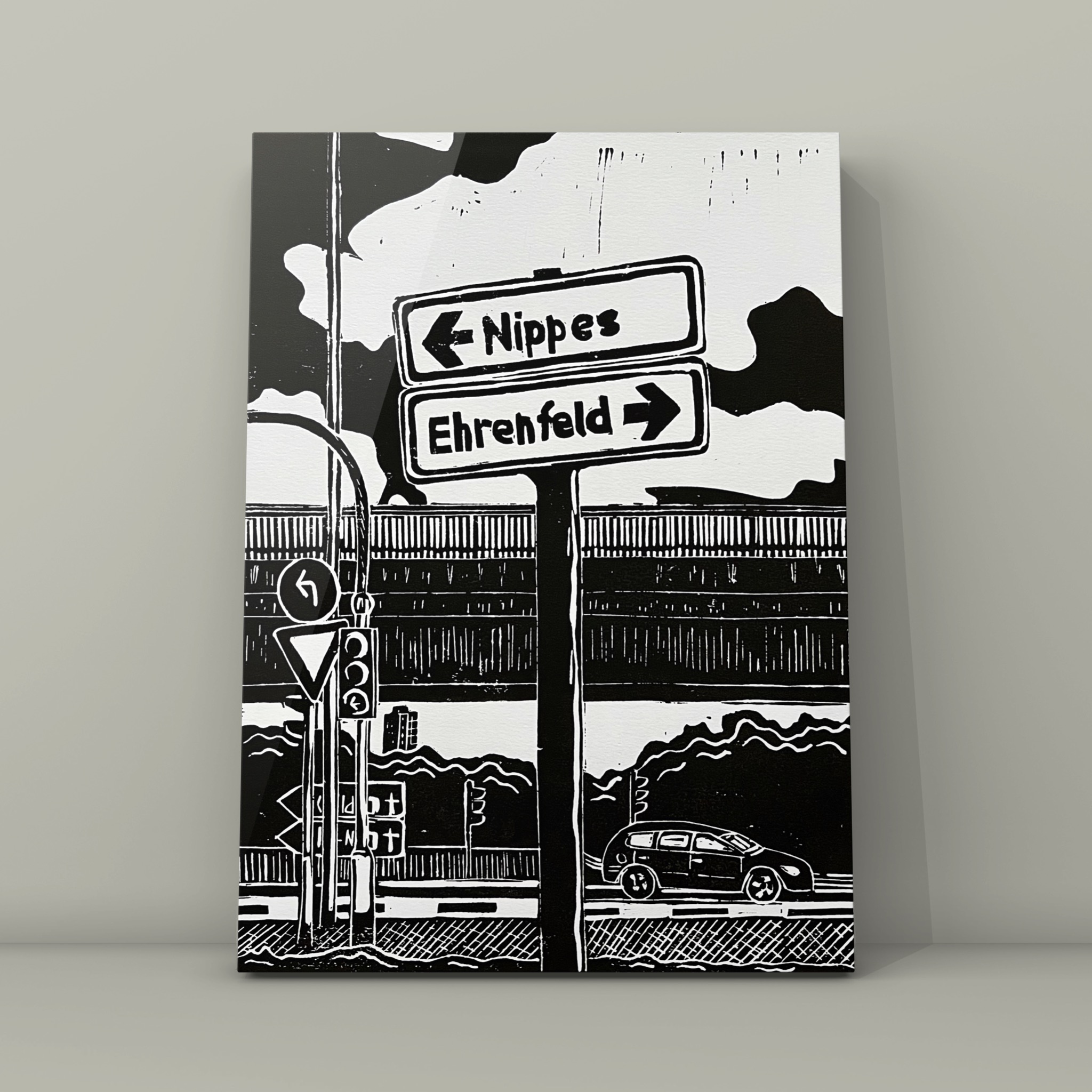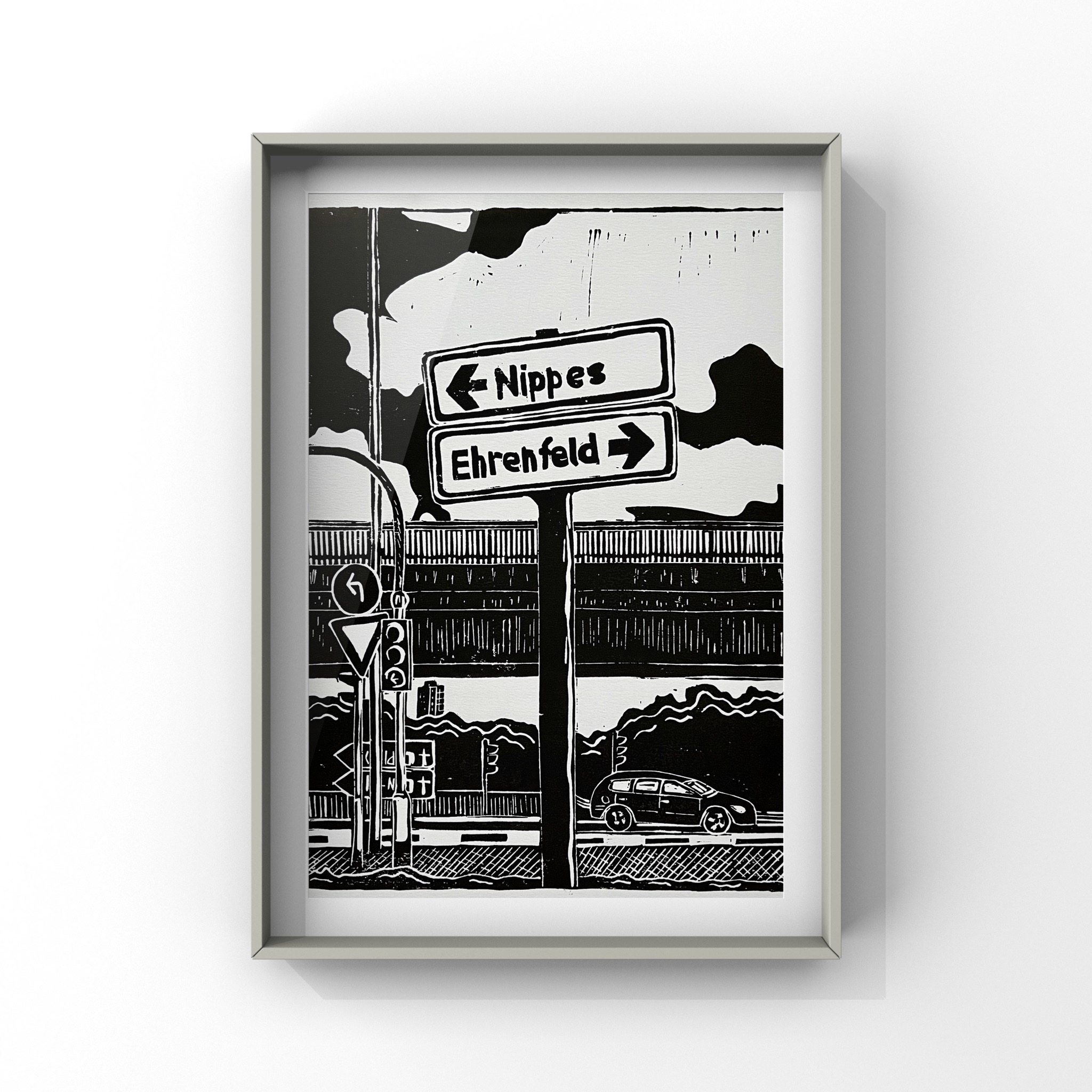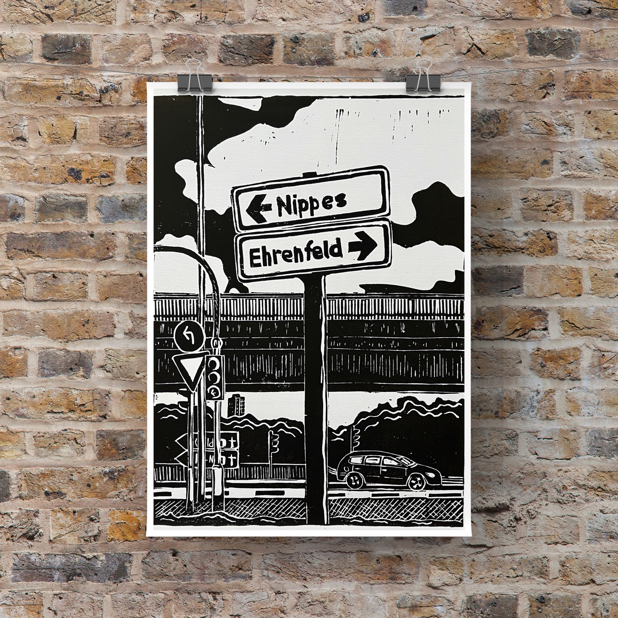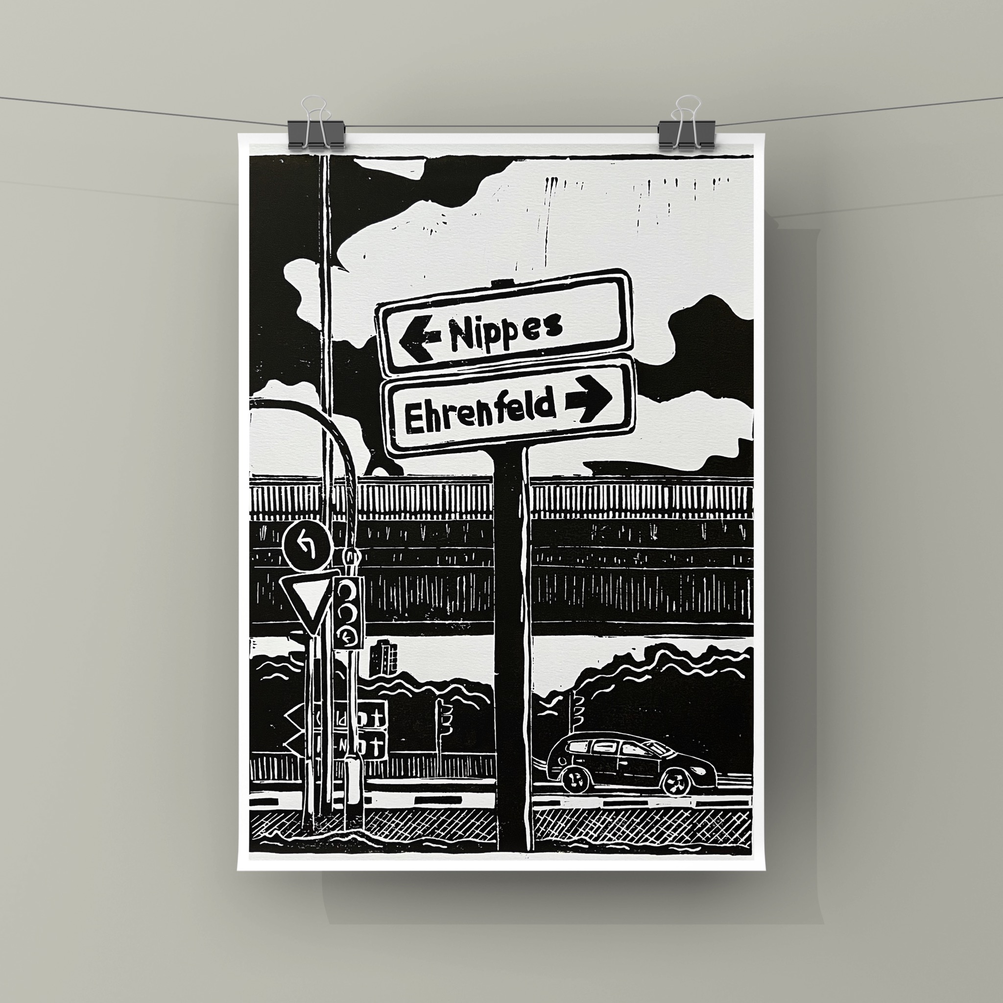 Linoldruck Köln Ehrenfeld/ Nippes A57 Autobahnausfahrt, Linocut,