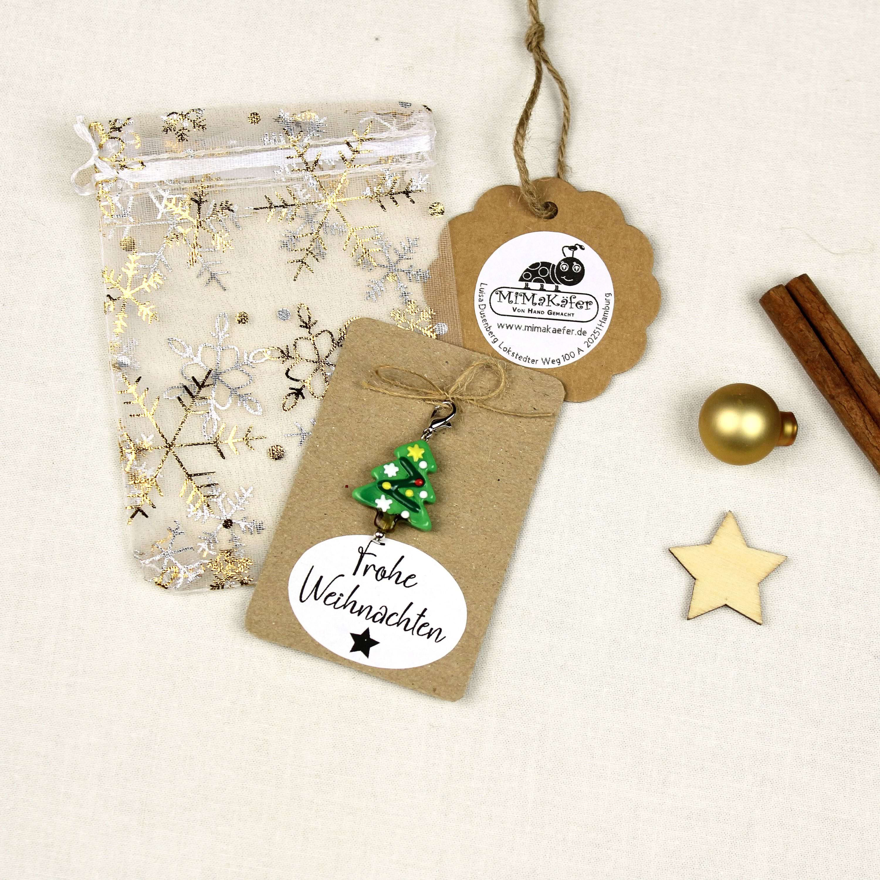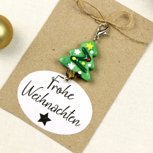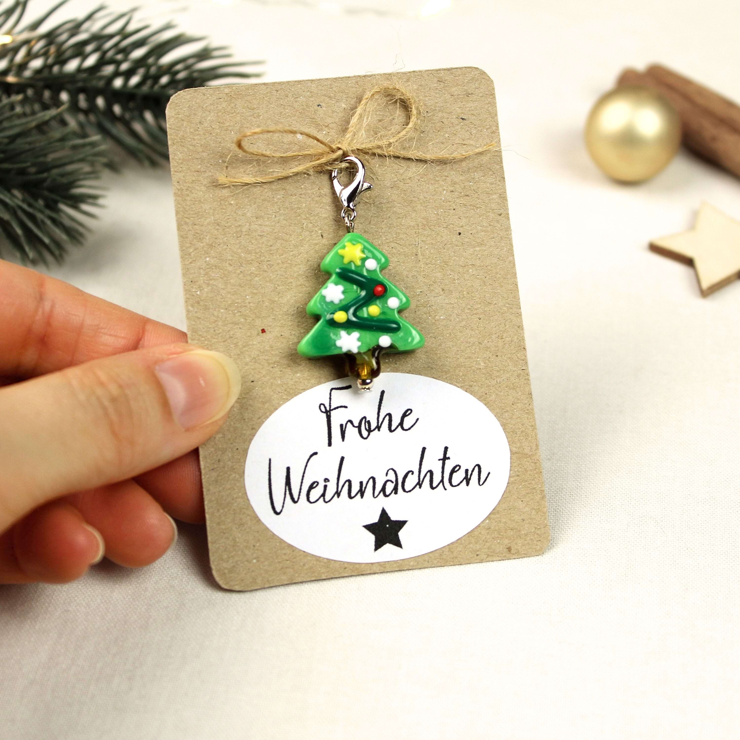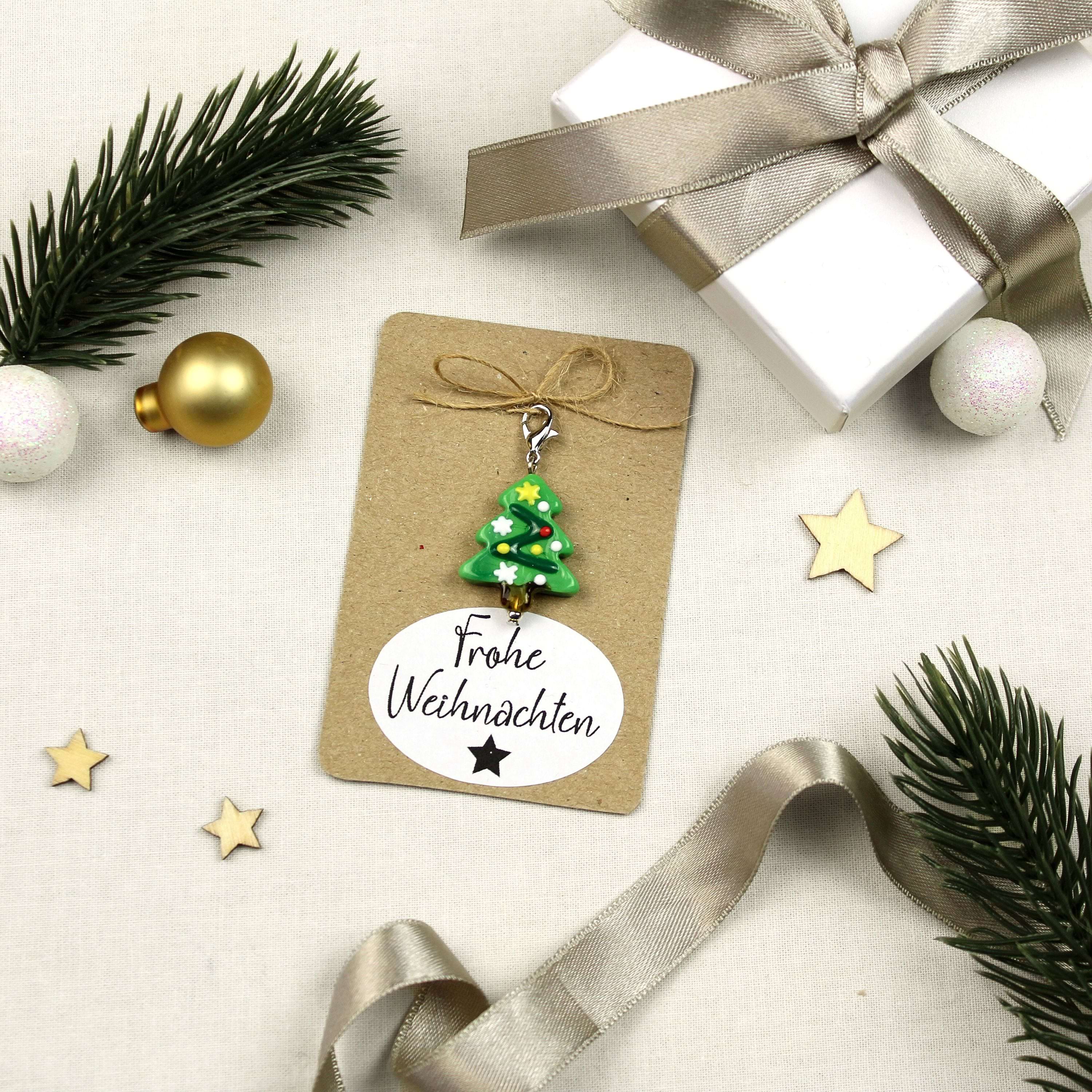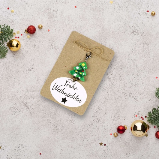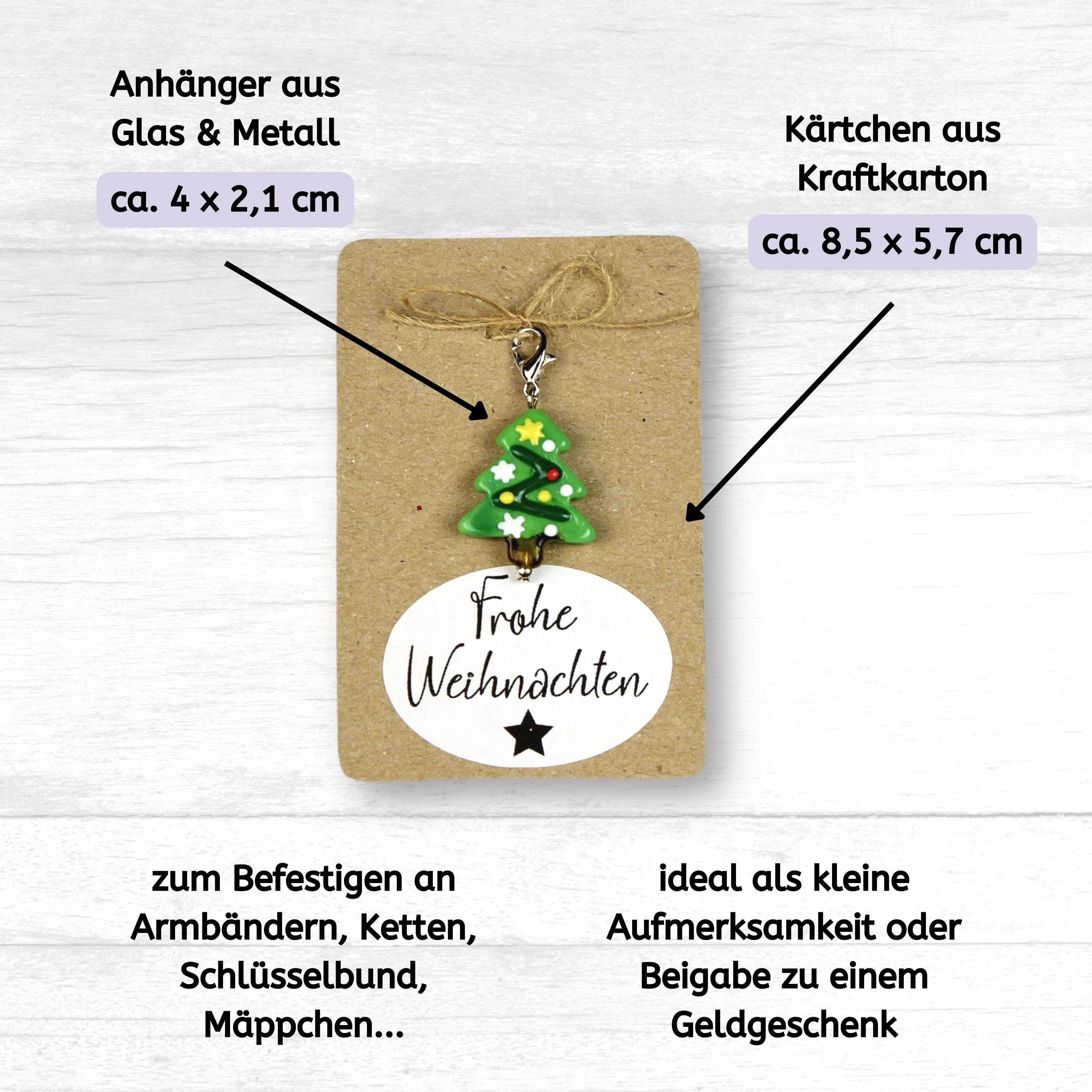 Glas-Weihnachtsanhänger Tannenbaum mit Karabiner – kleines Geschenk auf Geschenkkarte