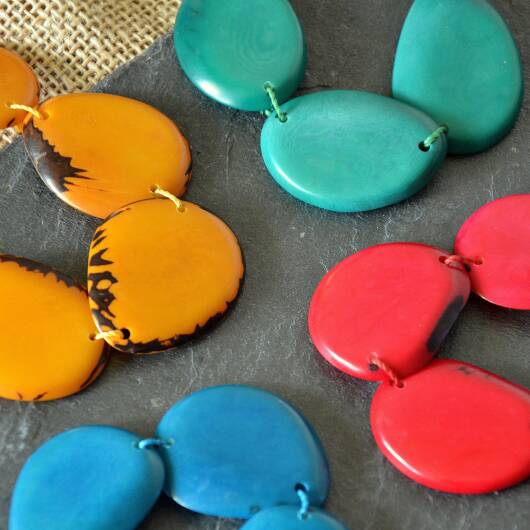 Aus den Nüssen werden in Handarbeit Scheiben geschnitten, gefärbt und poliert um diese leichten aber sehr widerstandsfähigen Stücke zu fertigen.