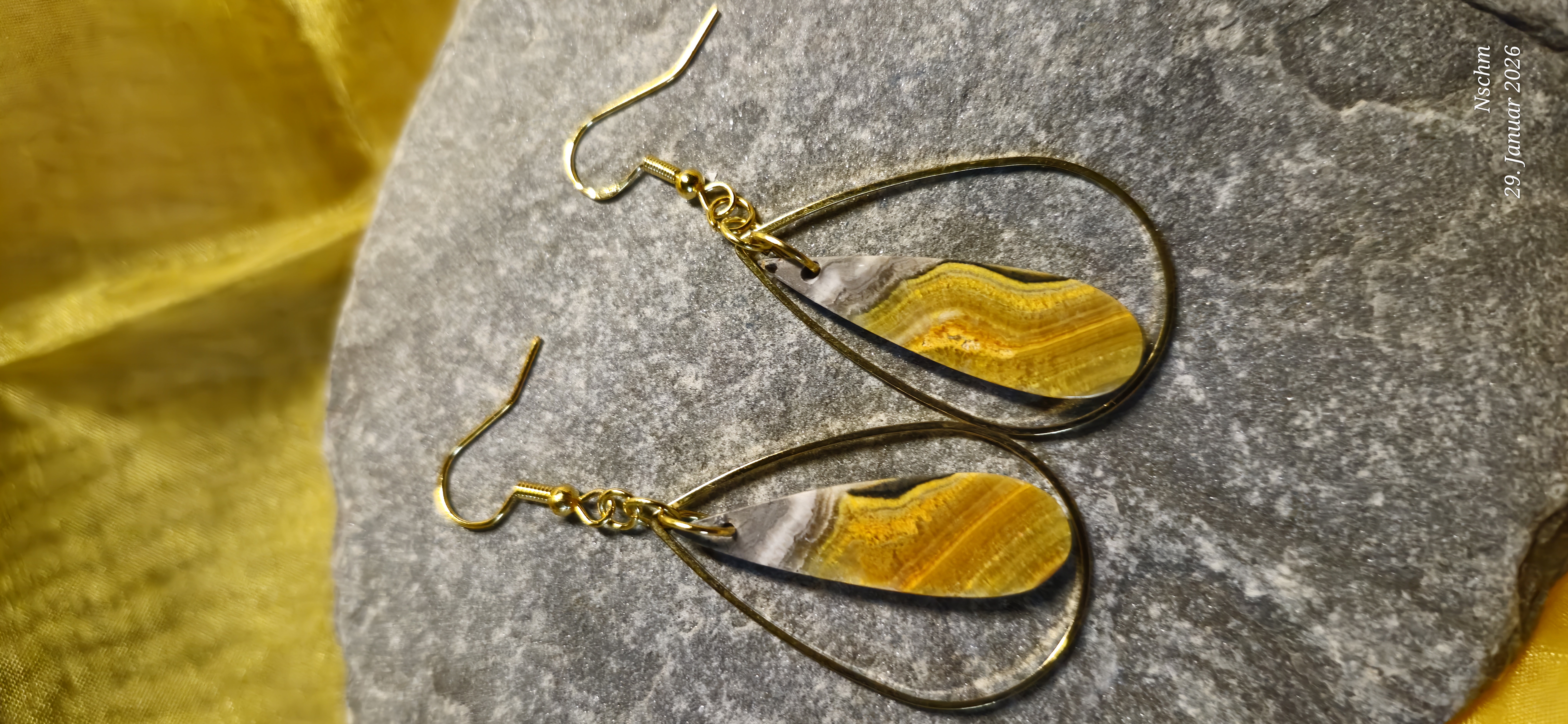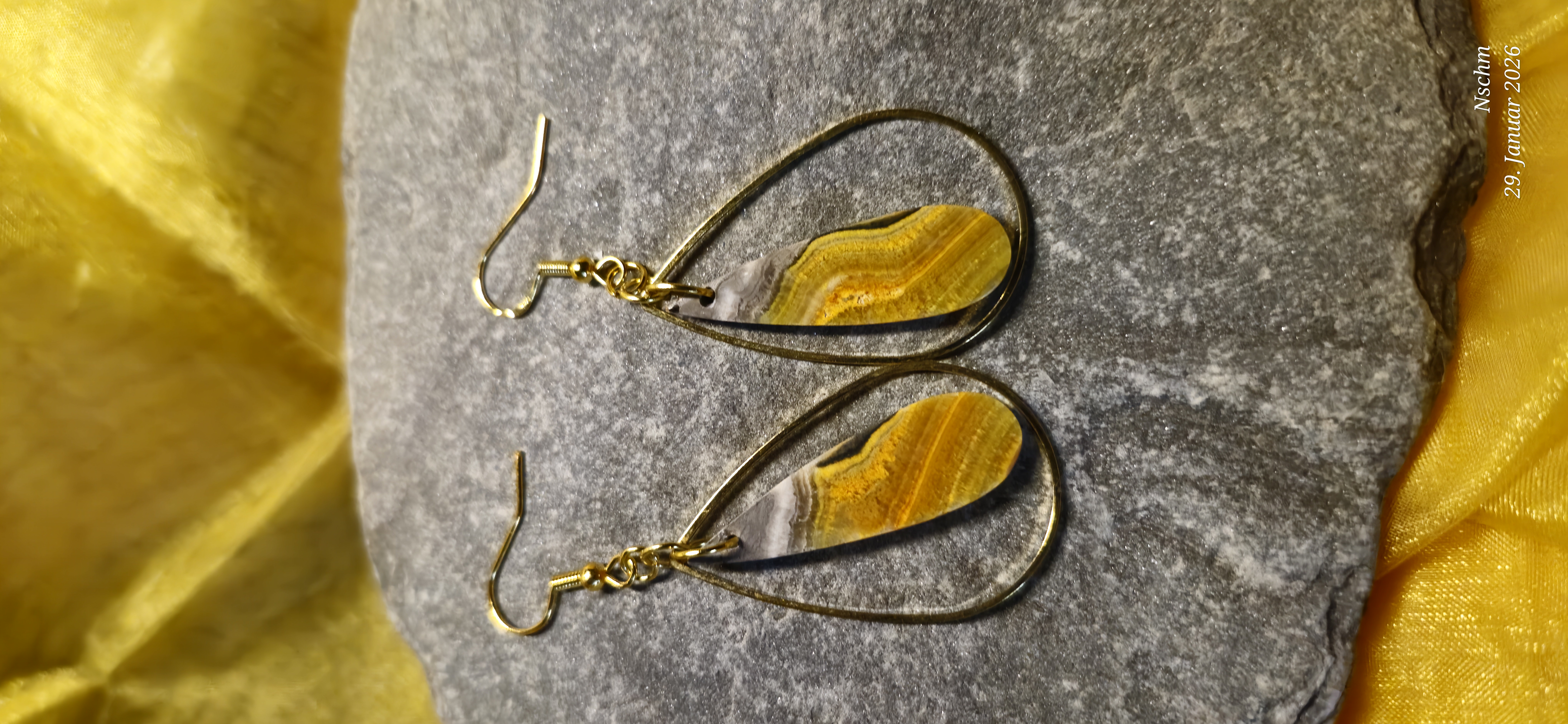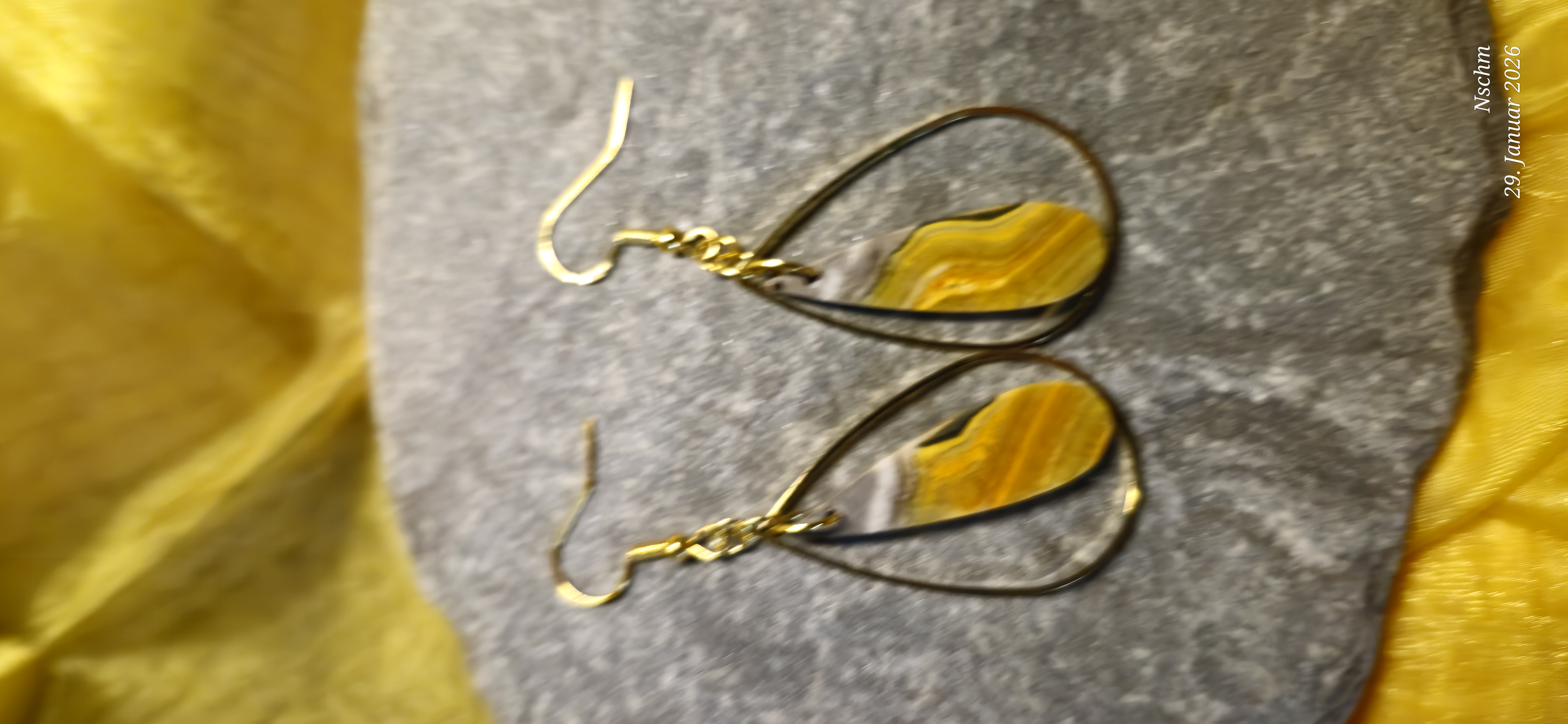 Die vergoldeten Ohrhaken (14,18 oder 24 Karat Gold) setzten warme Akzente und unterstreichen die Leuchtkraft des Steins, ohne ihm die Aufmerksamkeit zu nehmen. Bumblebee Jaspis steht für Lebensfreude, Kreativität und innere Stärke. Diese Ohrringe sind mehr als Schmuck - sie sind kleine Kraftbegleiter für den Alltag oder ein besonderes Geschenk für einen Herzensmenschen.