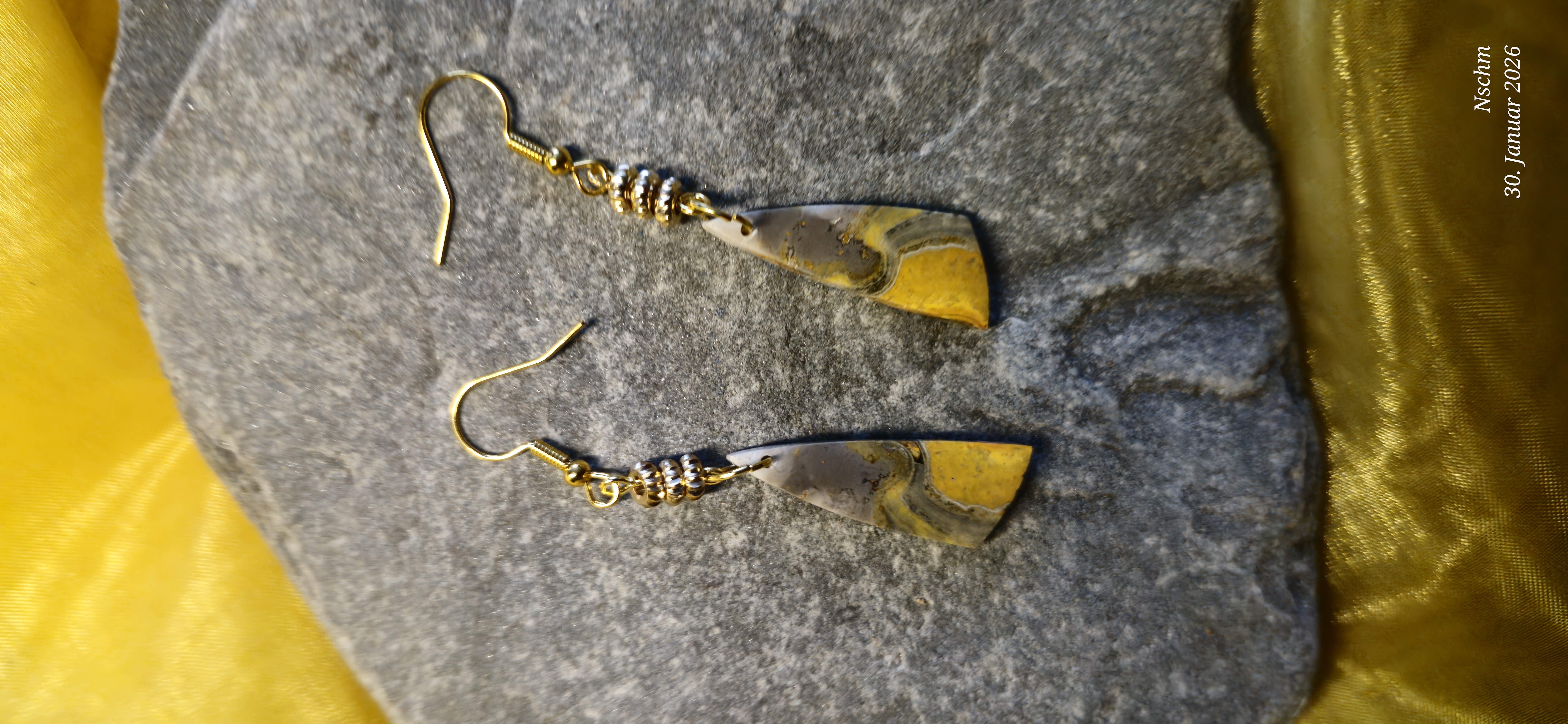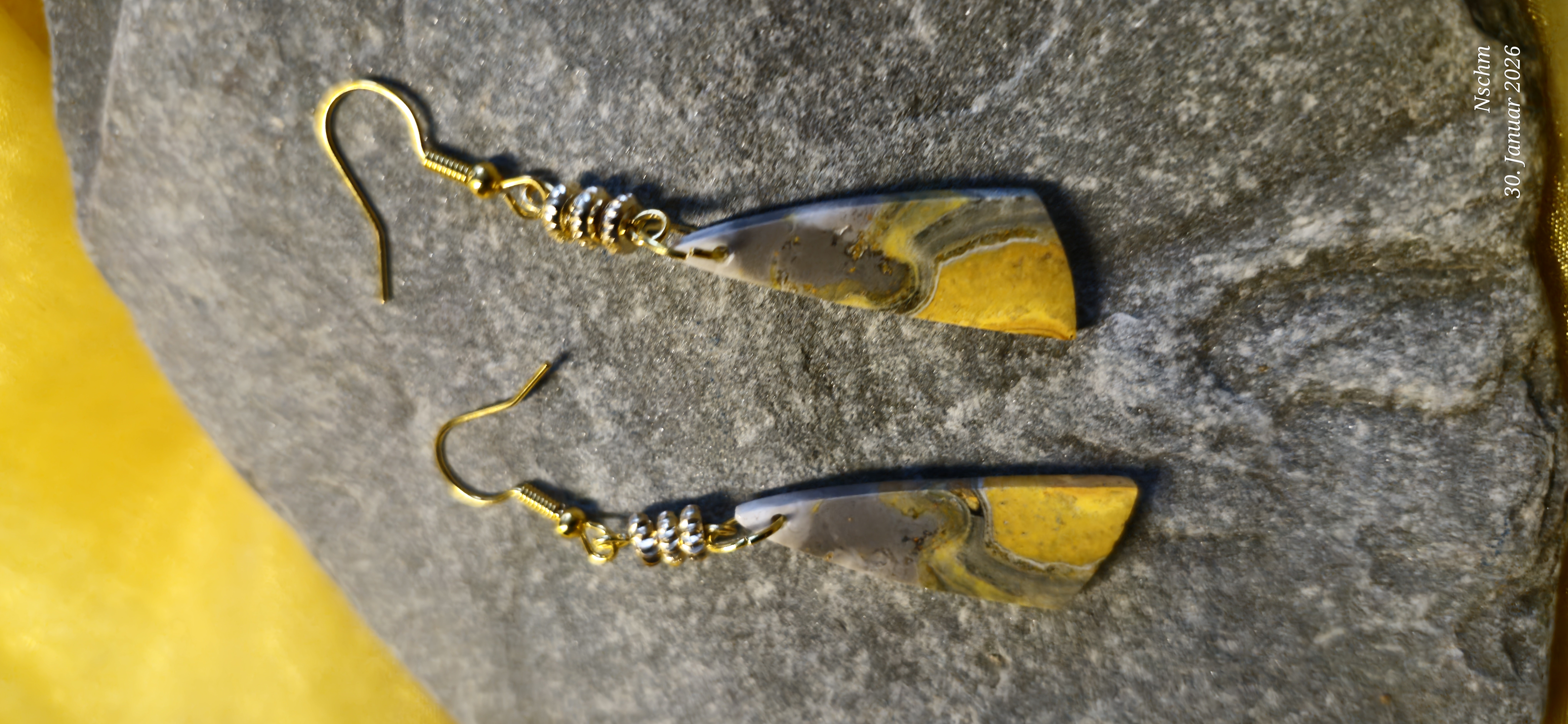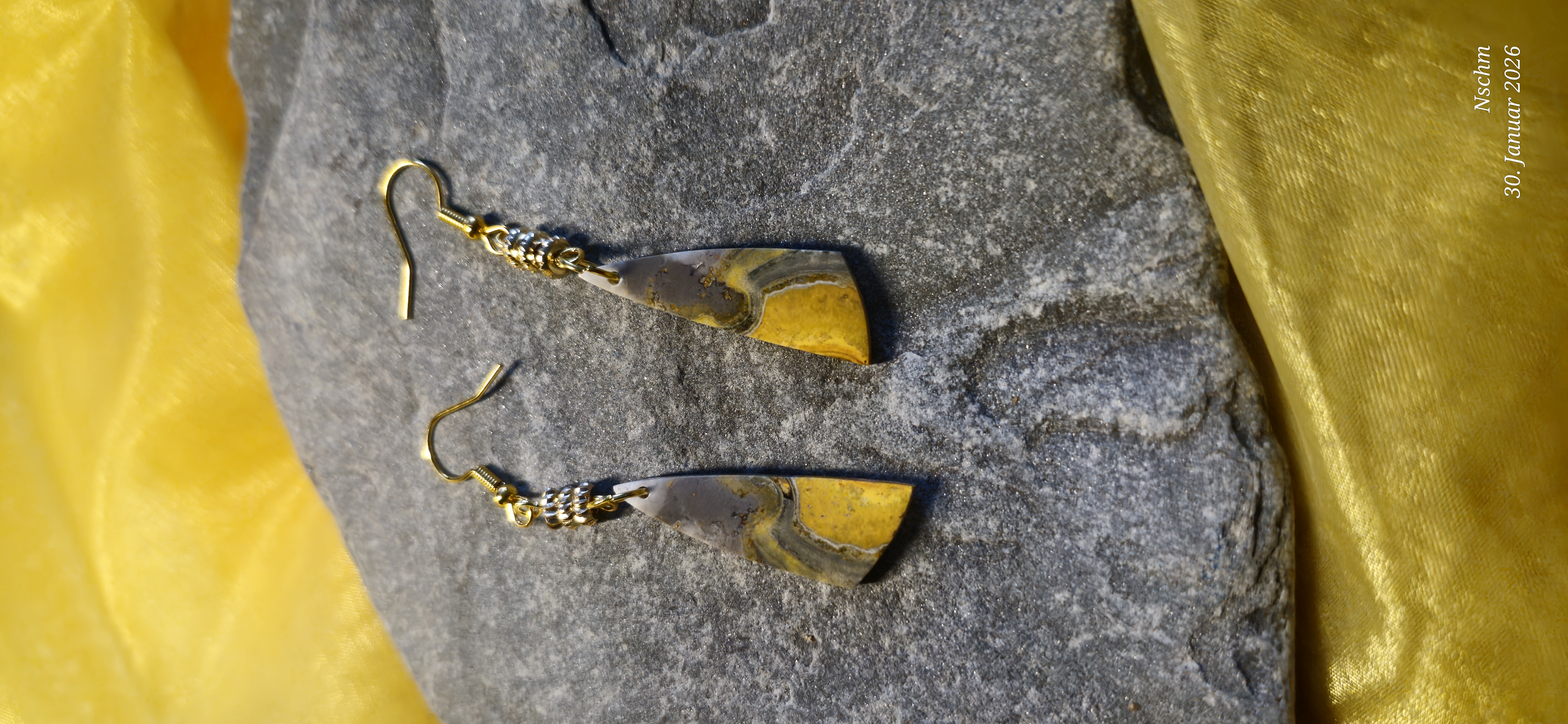 Diese einzigartigen Ohrringe aus Bumblebee Jaspis vereinen natürliche Schönheit mit liebevoller Handarbeit. Die intensiven Gelg-, Honig- und warmen Grautöne erinnern an Sonnenlicht, Blüten und die kraftvolle Lebendigkeit der Natur. Jeder Stein besitzt seine eigene Maserung - kein Paar gleicht dem anderen.