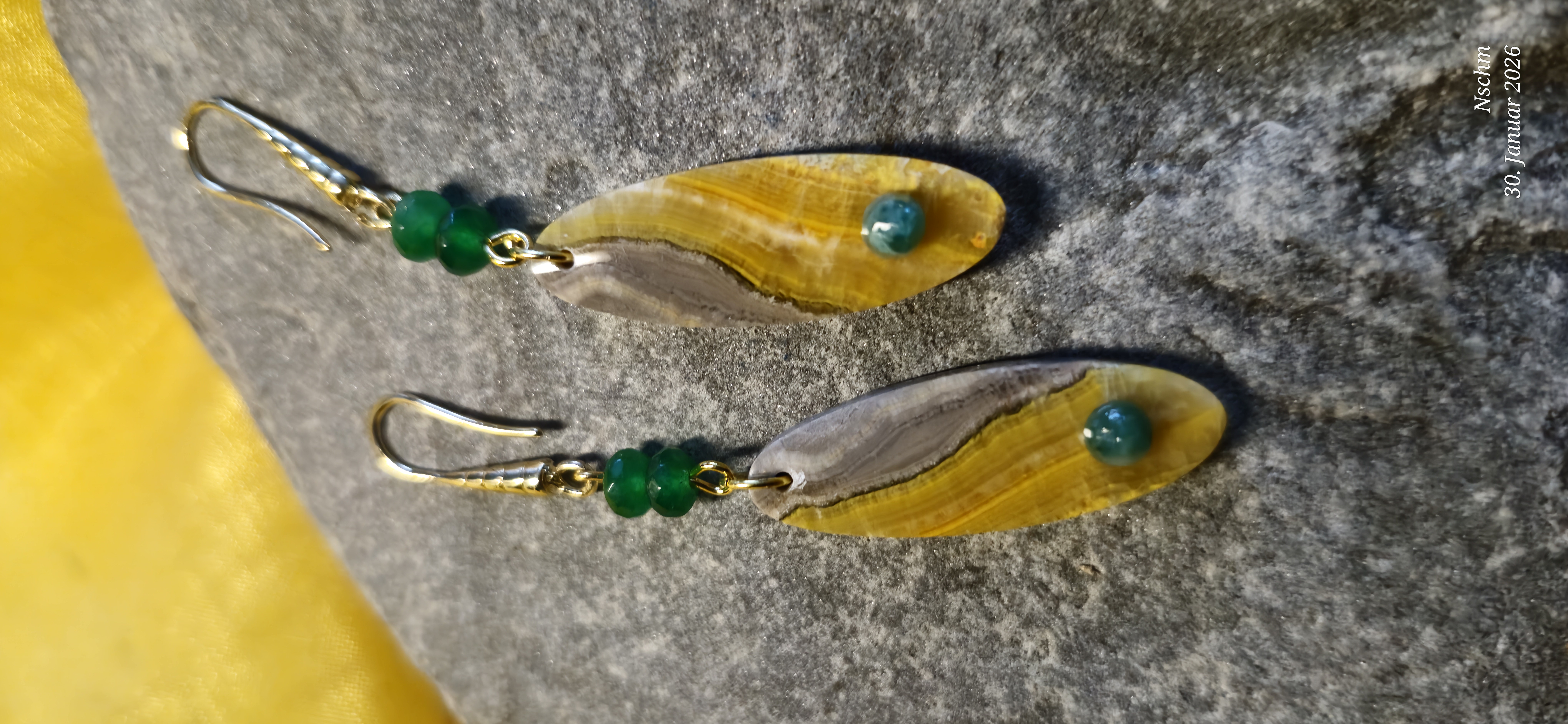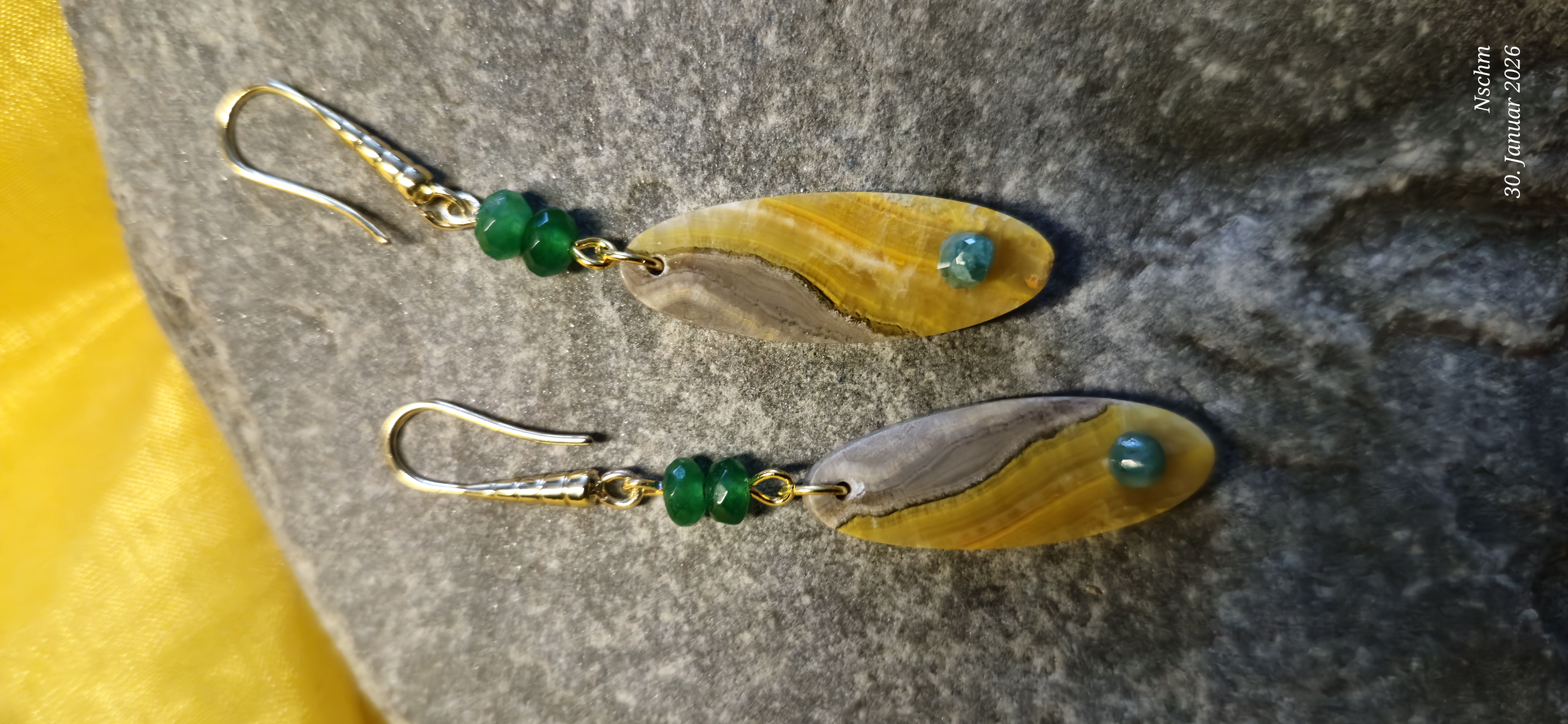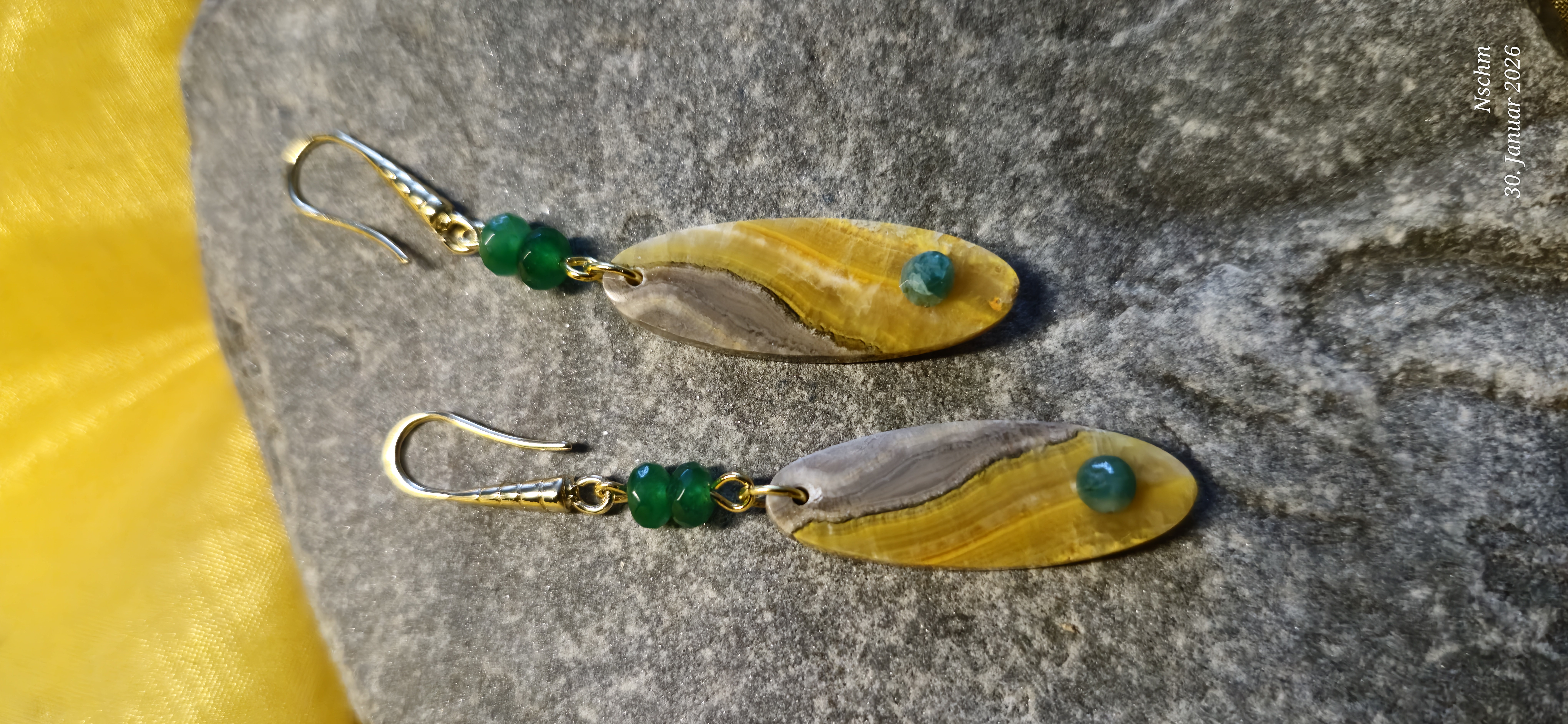 Diese einzigartigen Ohrringe aus Bumblebee Jaspis und echten Smaragdsteinen vereinen natürliche Schönheit mit liebevoller Handarbeit. Die intensiven Gelg-, Honig- und warmen Grautöne erinnern an Sonnenlicht, Blüten und die kraftvolle Lebendigkeit der Natur. Jeder Stein besitzt seine eigene Maserung - kein Paar gleicht dem anderen.