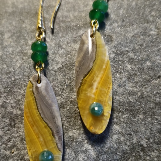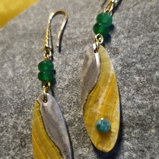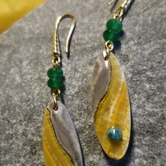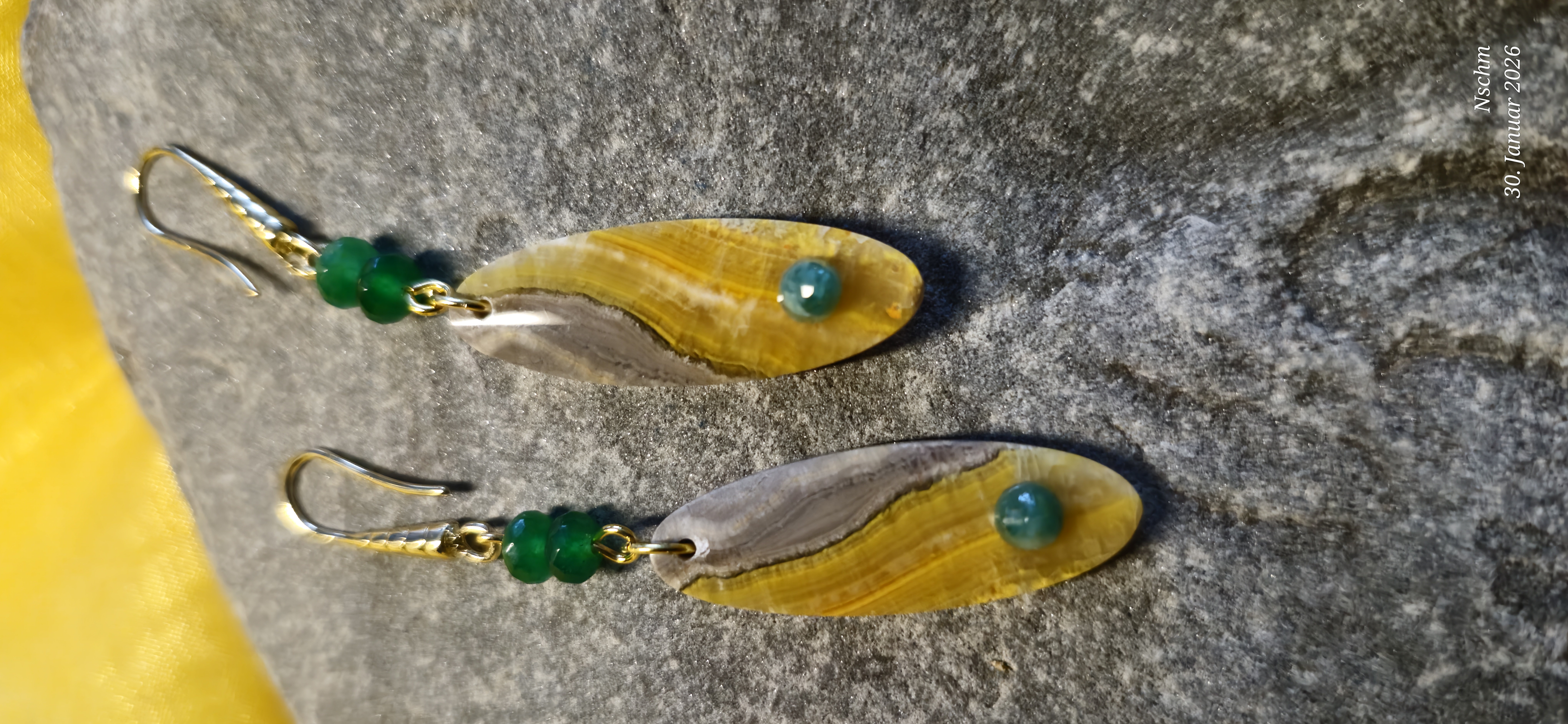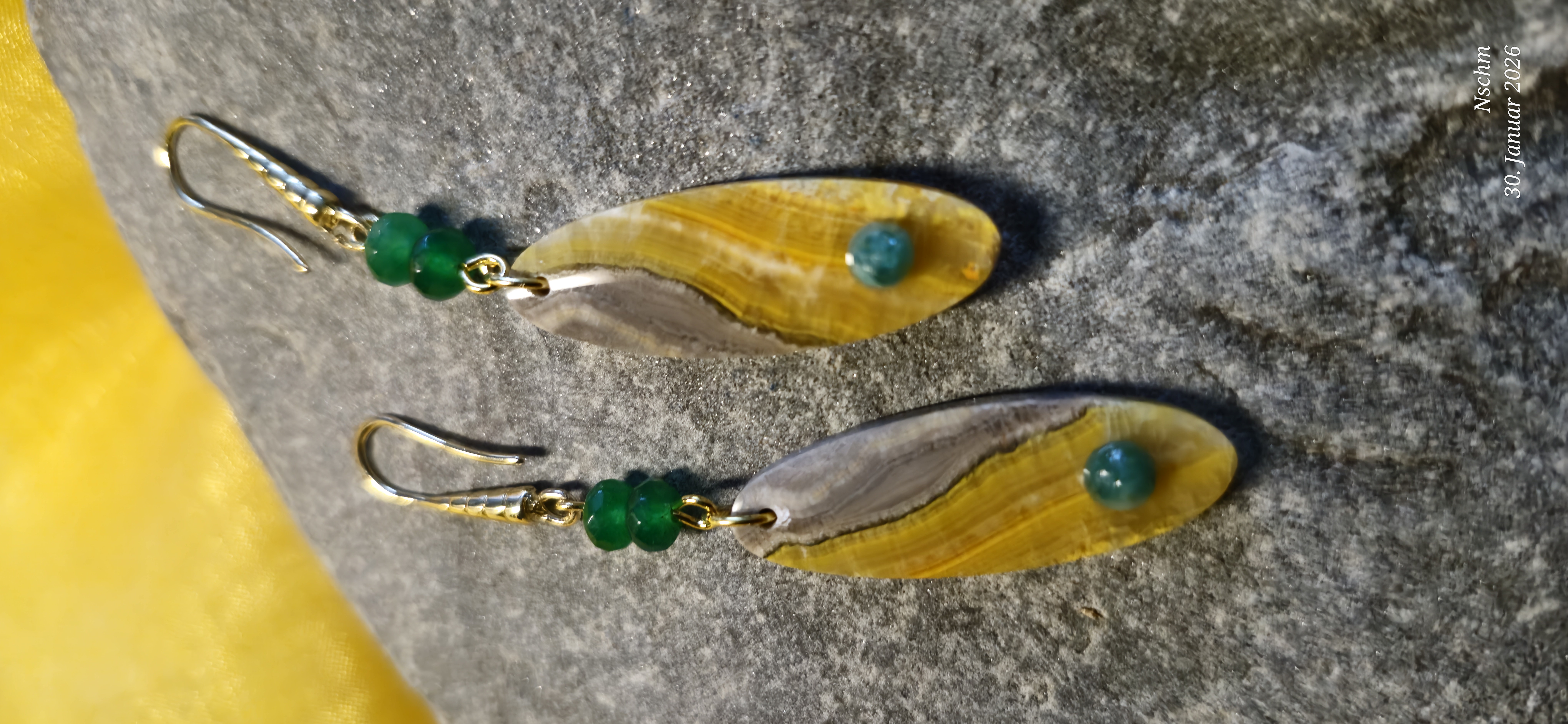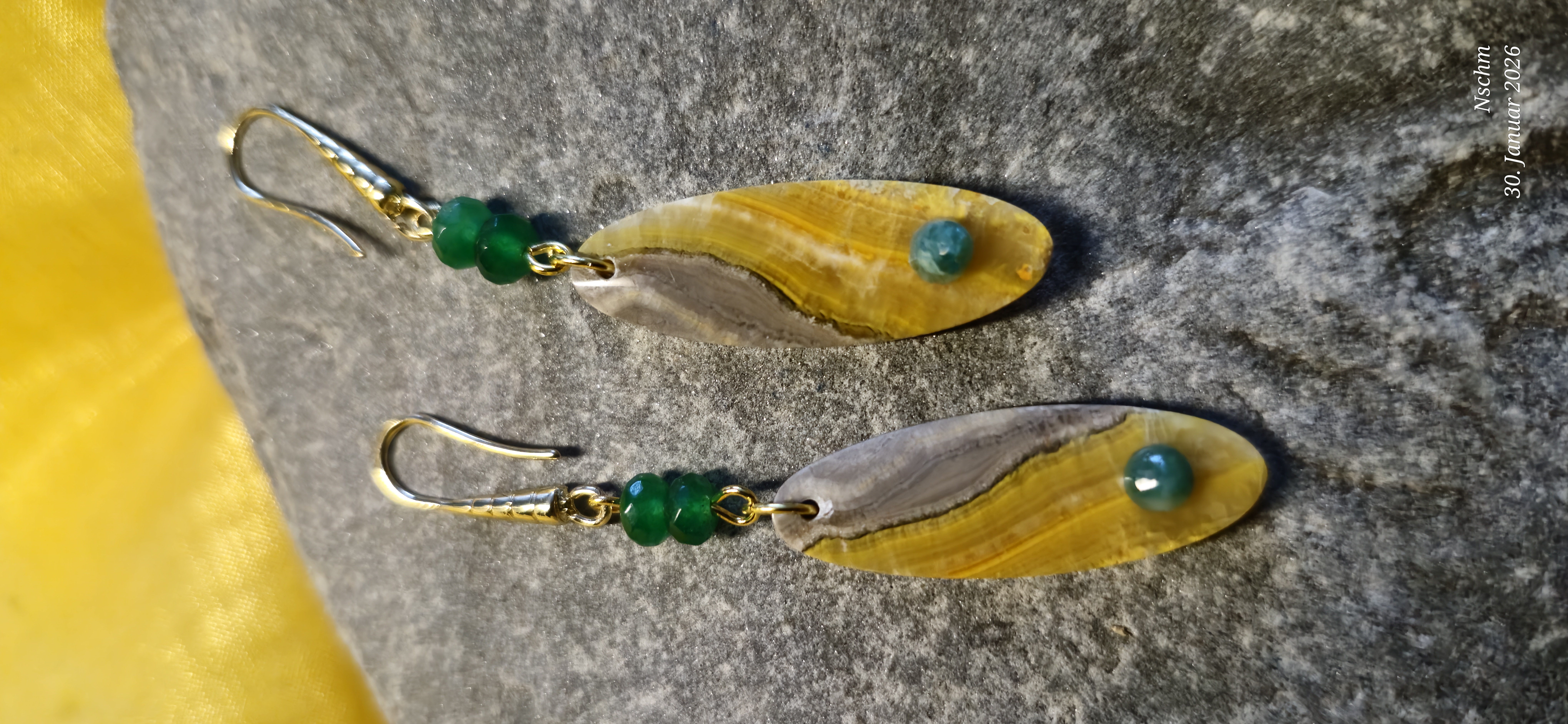 Diese einzigartigen Ohrringe aus Bumblebee Jaspis und echten Smaragdsteinen vereinen natürliche Schönheit mit liebevoller Handarbeit. Die intensiven Gelg-, Honig- und warmen Grautöne erinnern an Sonnenlicht, Blüten und die kraftvolle Lebendigkeit der Natur. Jeder Stein besitzt seine eigene Maserung - kein Paar gleicht dem anderen.