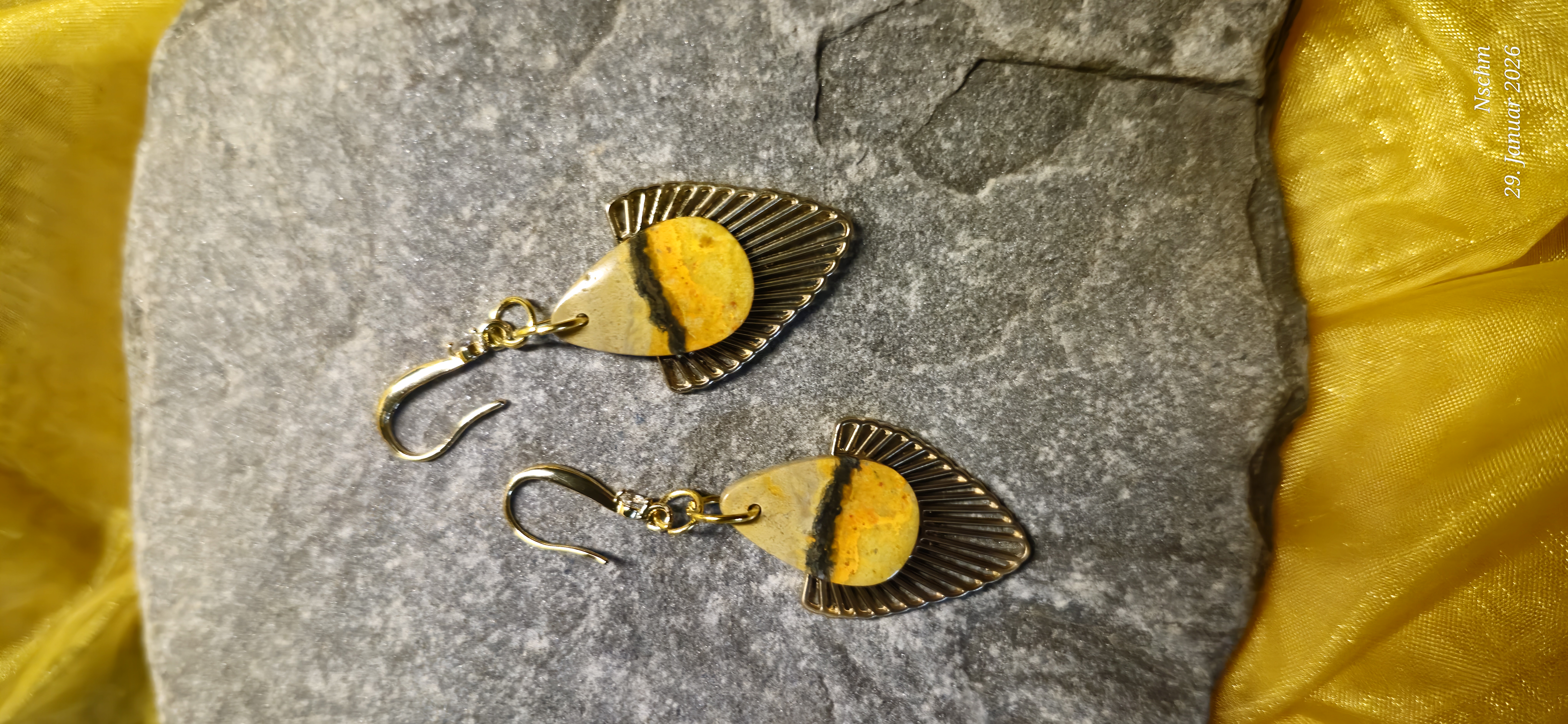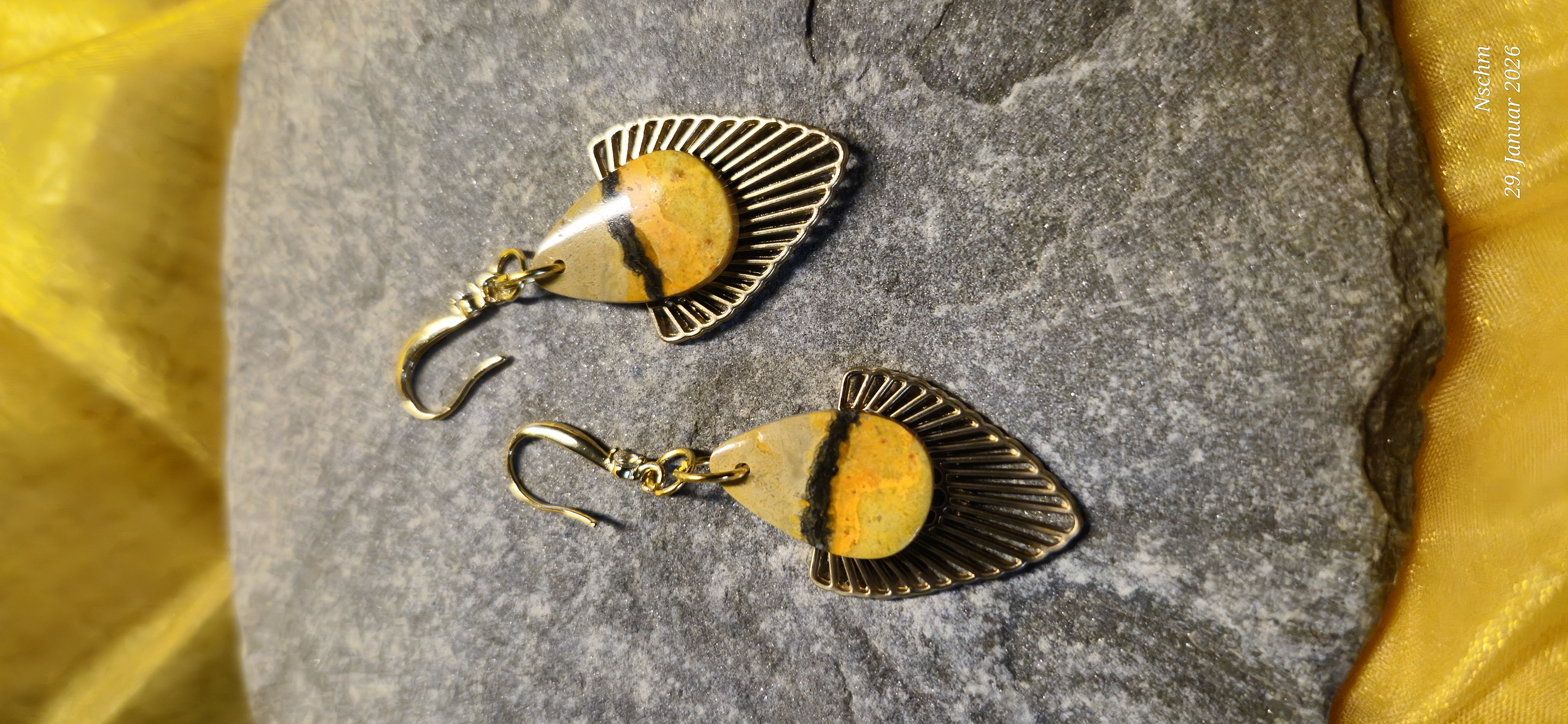 Die vergoldeten Ohrhaken (14,18 oder 24 Karat Gold) setzten warme Akzente und unterstreichen die Leuchtkraft des Steins, ohne ihm die Aufmerksamkeit zu nehmen. Bumblebee Jaspis steht für Lebensfreude, Kreativität und innere Stärke. Diese Ohrringe sind mehr als Schmuck - sie sind kleine Kraftbegleiter für den Alltag oder ein besonderes Geschenk für einen Herzensmenschen.