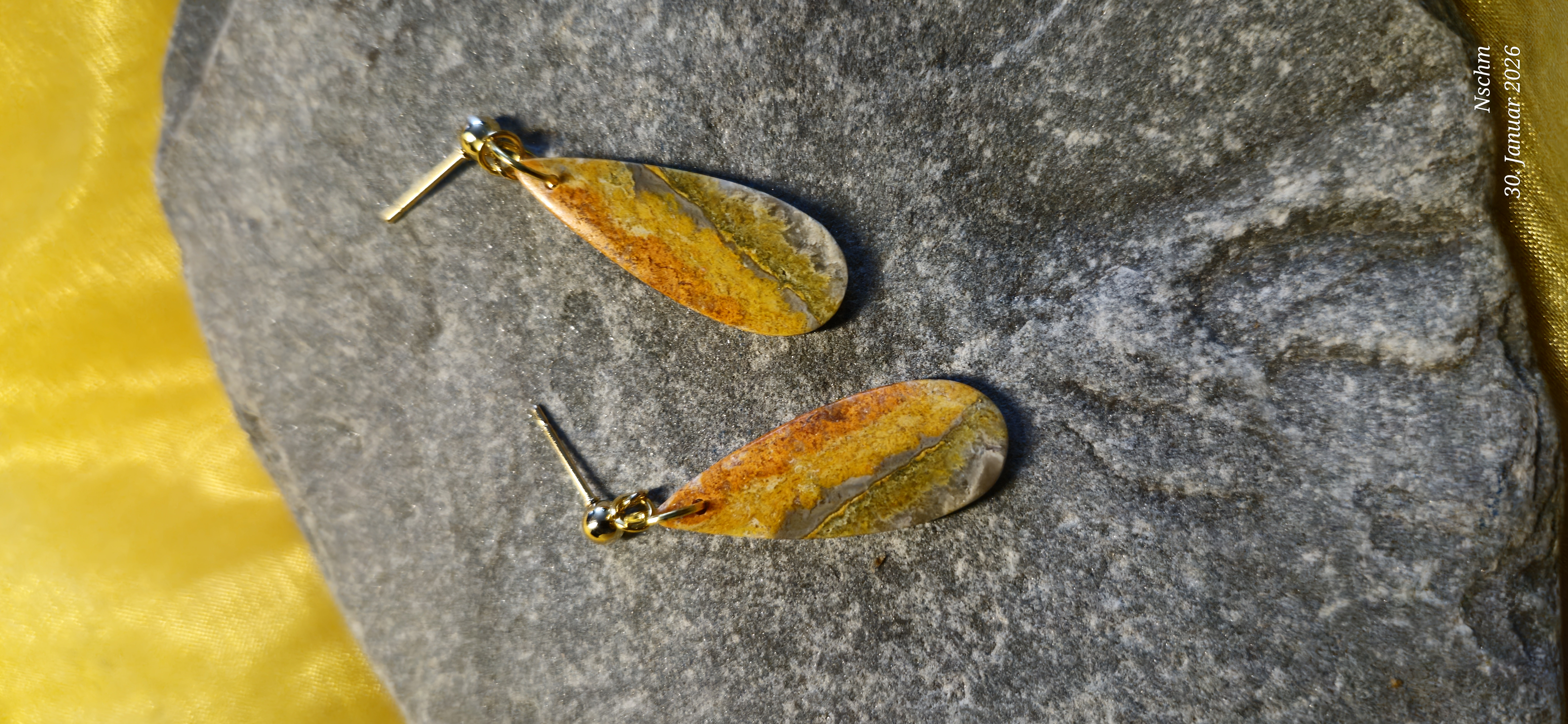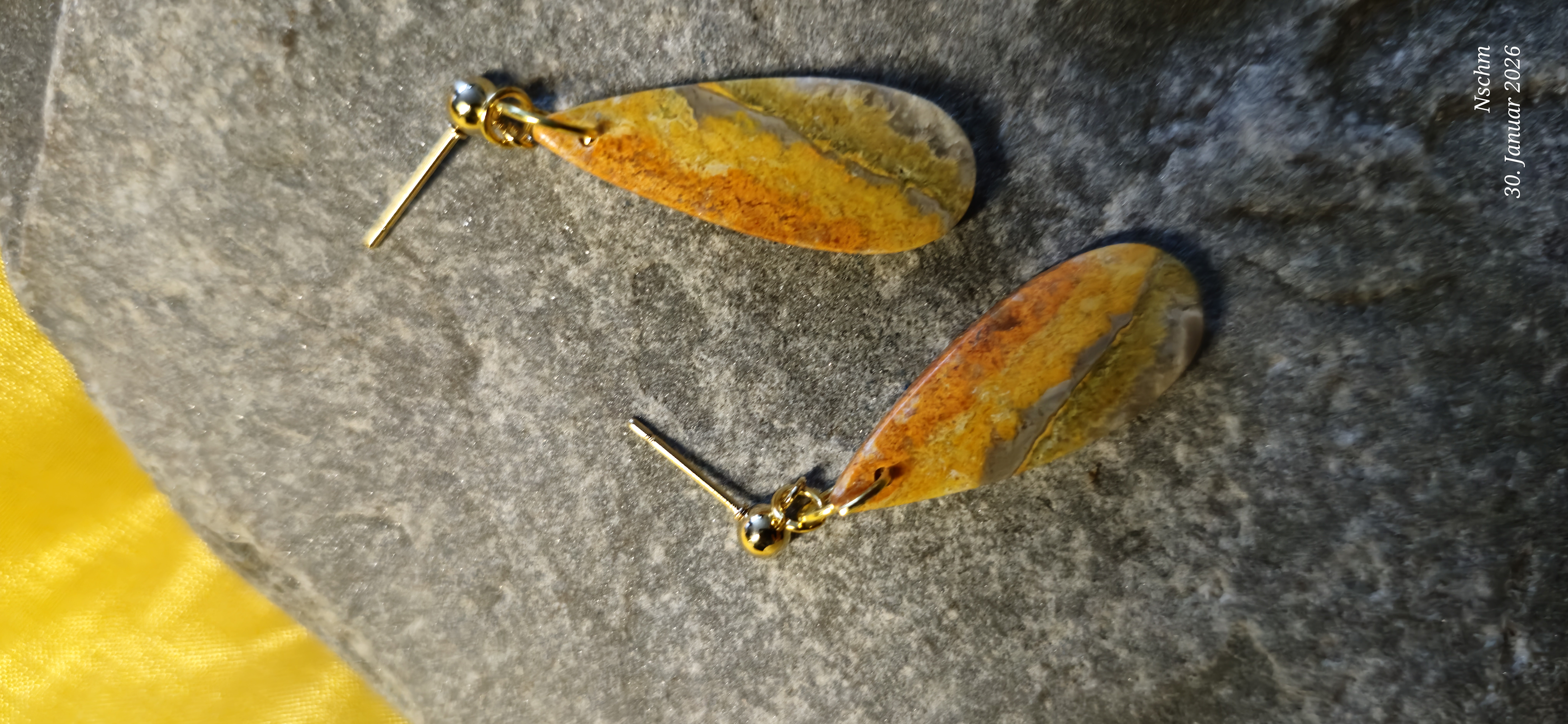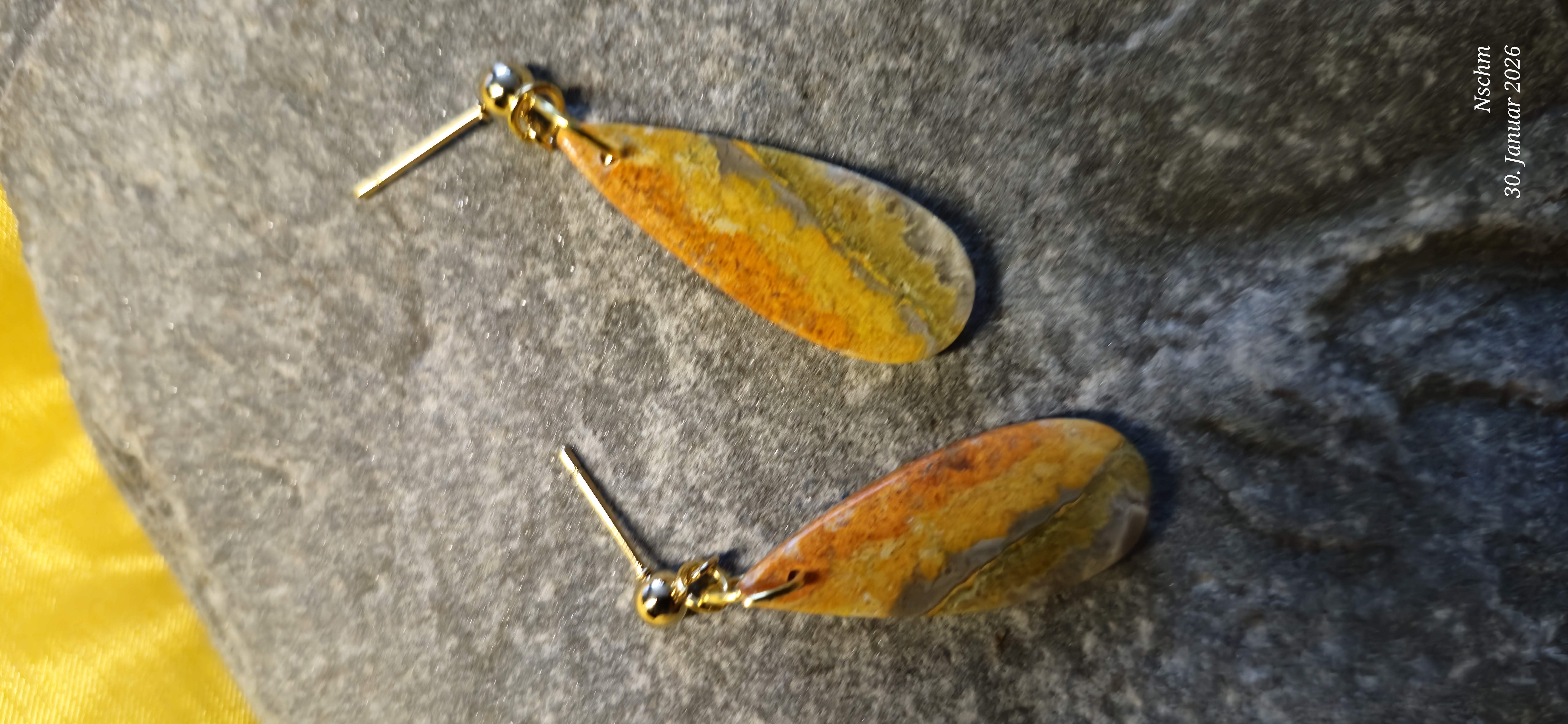Die vergoldeten Ohrhaken (14,18 oder 24 Karat Gold) setzten warme Akzente und unterstreichen die Leuchtkraft des Steins, ohne ihm die Aufmerksamkeit zu nehmen. Bumblebee Jaspis steht für Lebensfreude, Kreativität und innere Stärke. Diese Ohrringe sind mehr als Schmuck - sie sind kleine Kraftbegleiter für den Alltag oder ein besonderes Geschenk für einen Herzensmenschen.