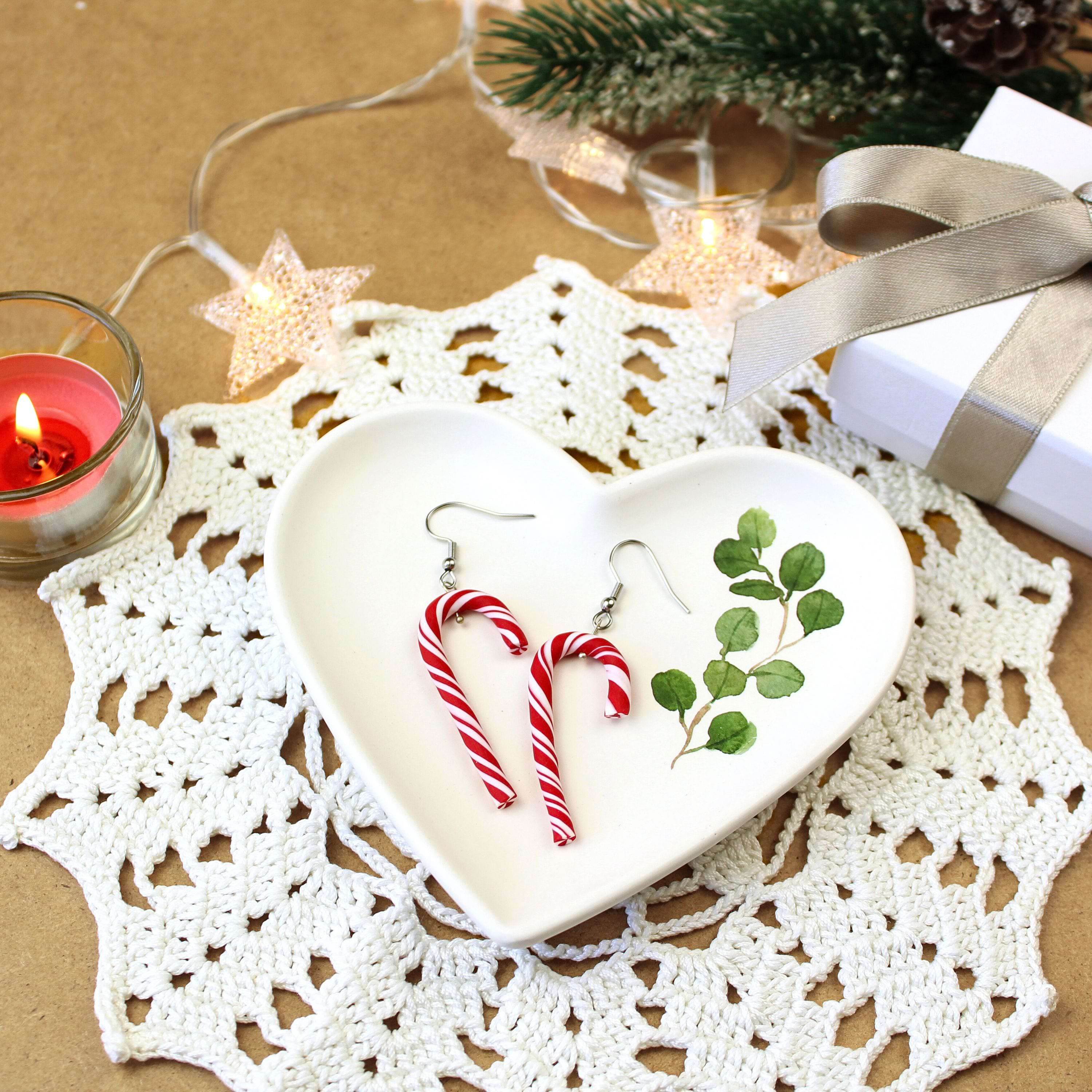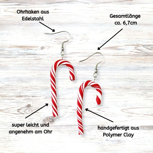 Die Zuckerstangen forme ich einzeln aus Polymer Clay und befestige sie an Ohrhaken aus Edelstahl. So bleiben die Ohrringe leicht, angenehm zu tragen und langlebig – eine gute Wahl für empfindliche Ohren. Das klassische rot-weiße Muster passt zu vielen Winterlooks und setzt ein kleines, fröhliches Detail in der Adventszeit.