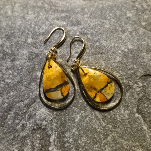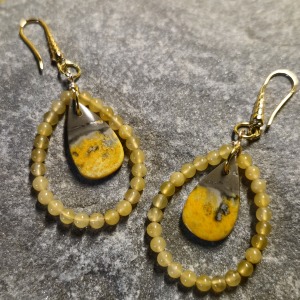 Diese einzigartigen Ohrringe aus Bumblebee Jaspis vereinen natürliche Schönheit mit liebevoller Handarbeit. Die intensiven Gelg-, Honig- und warmen Grautöne erinnern an Sonnenlicht, Blüten und die kraftvolle Lebendigkeit der Natur.  Jeder Stein besitzt seine eigene Maserung - kein Paar gleicht...