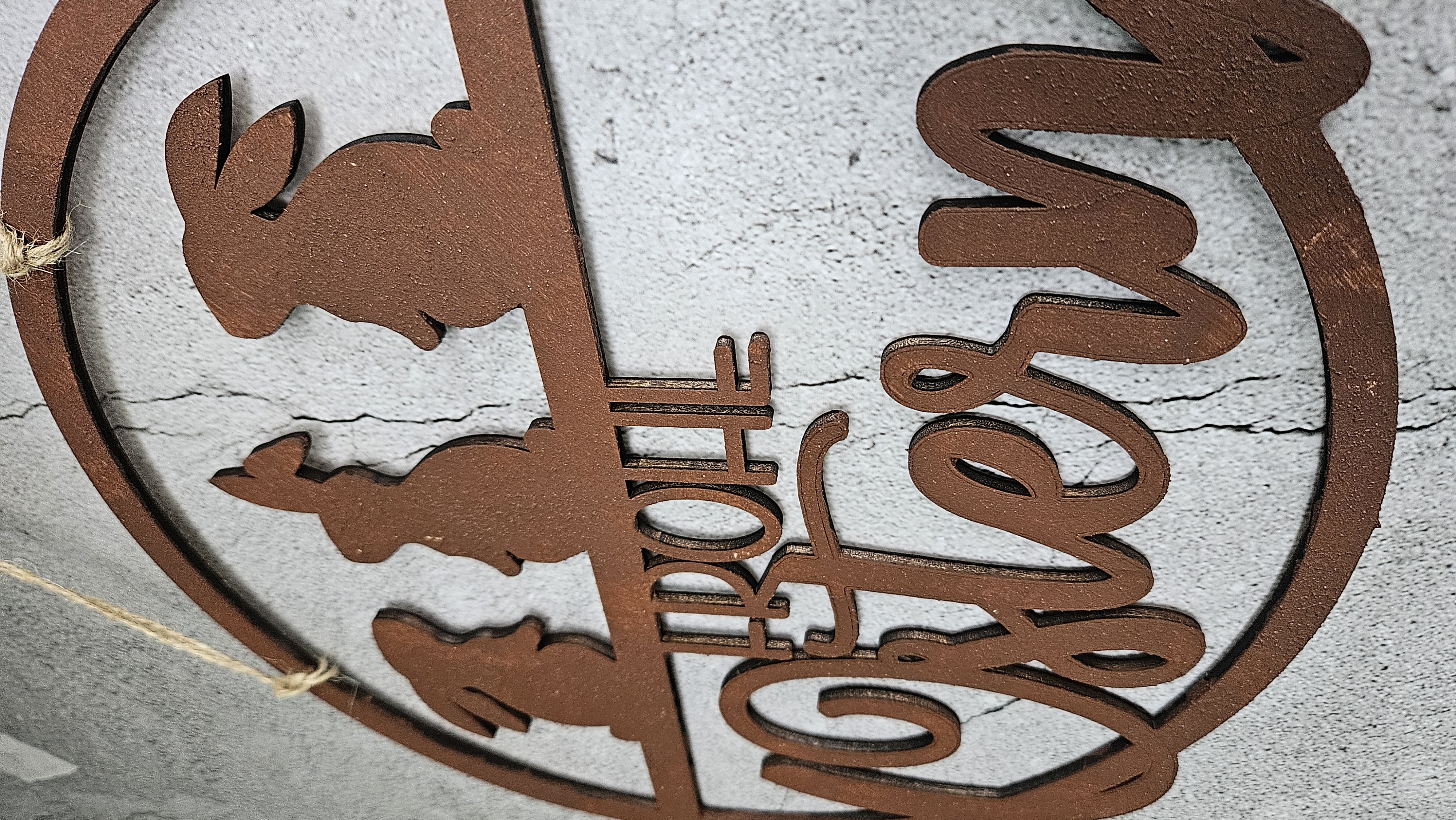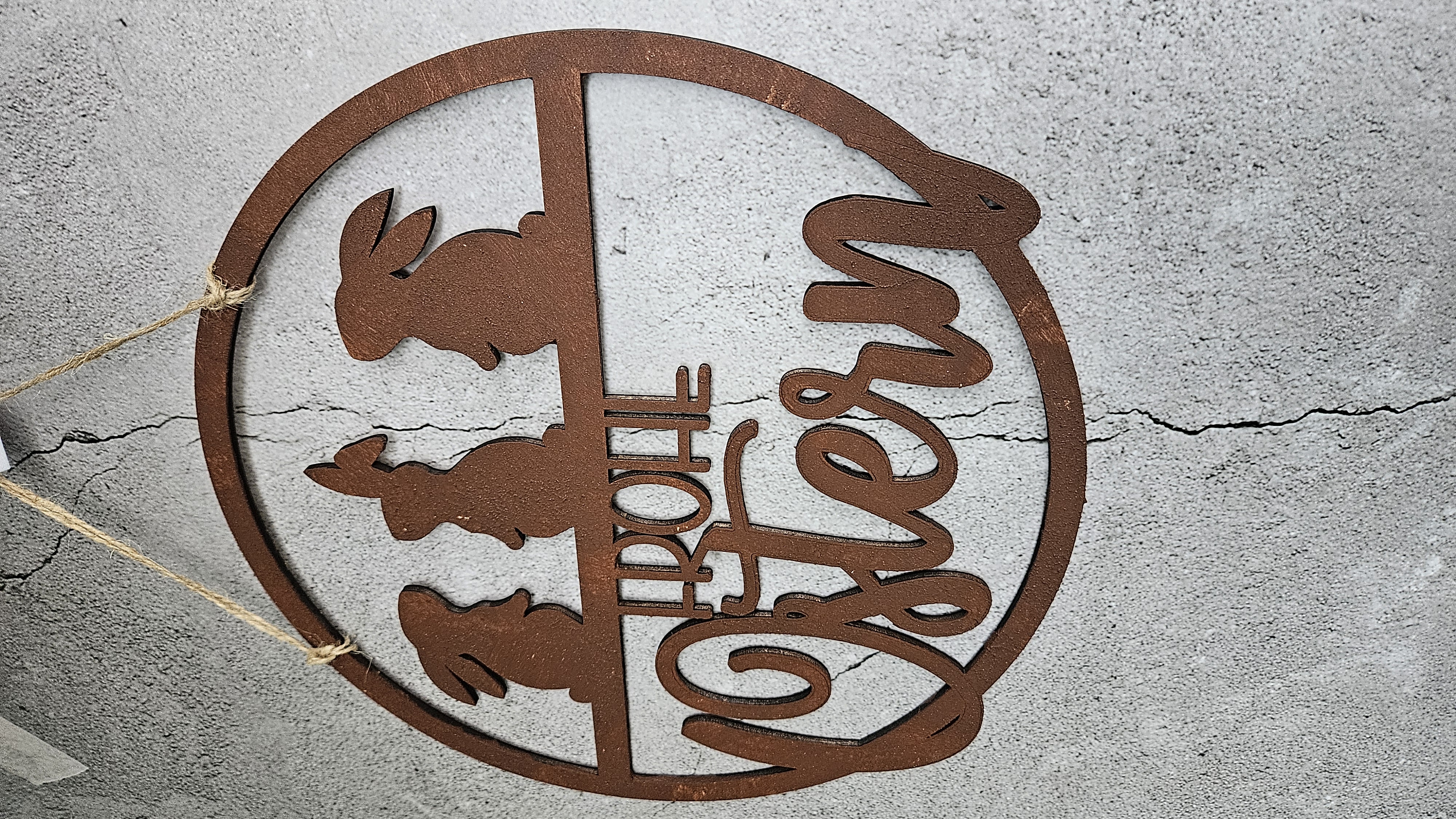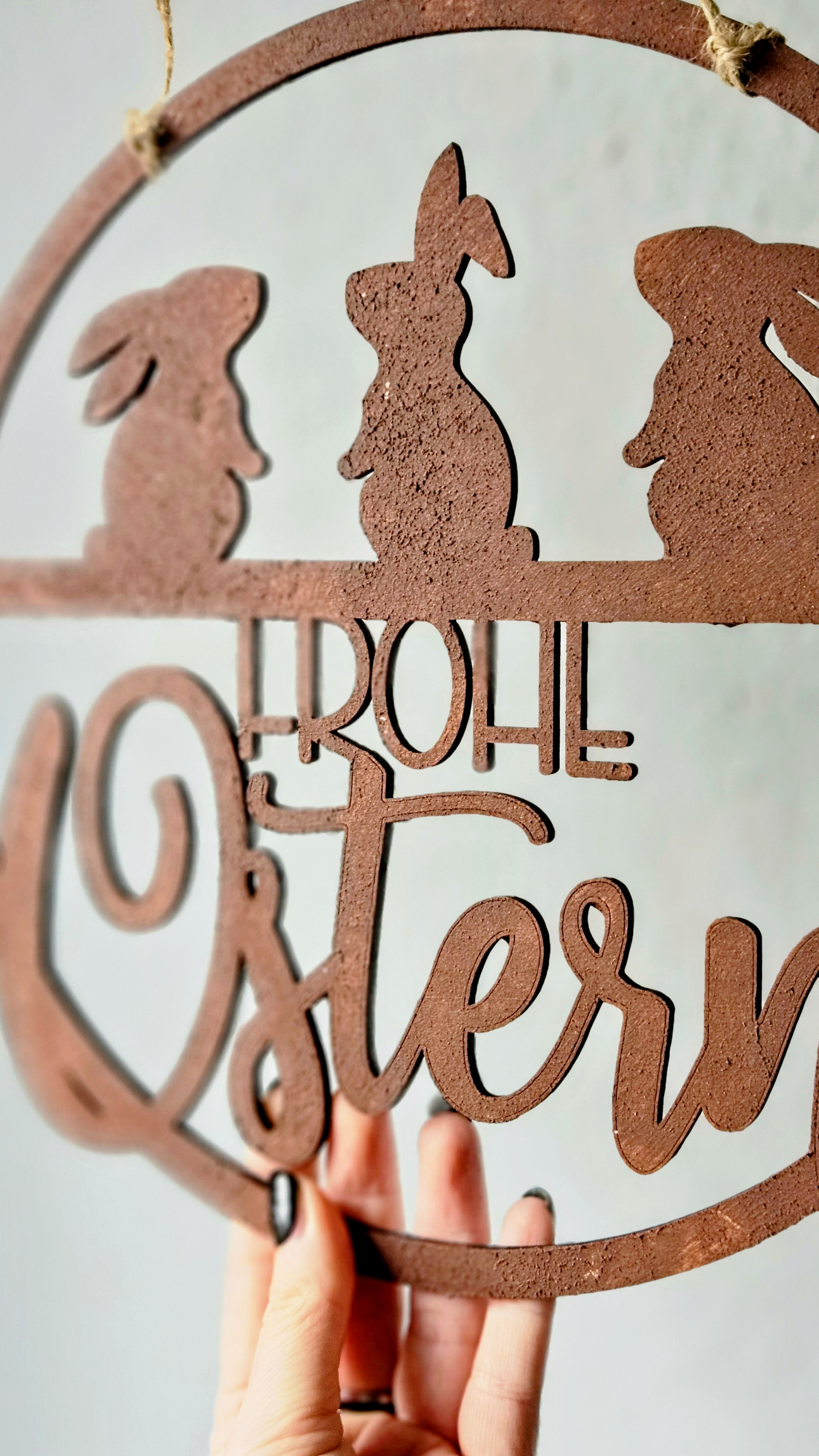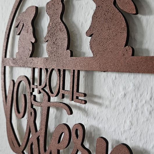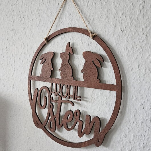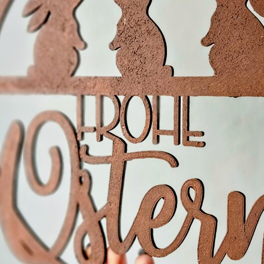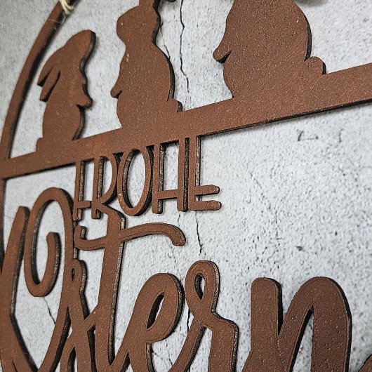 Dieser handgefertigte Osterkranz aus 4 mm starkem Pappelsperrholz überzeugt durch präzise Lasercut-Verarbeitung und eine detailreiche Rost-Optik im authentischen Metall-Look. Die Kombination aus filigraner Schnittführung und markanter Oberflächengestaltung verleiht dem Kranz eine hochwertige, moderne Ausstrahlung.