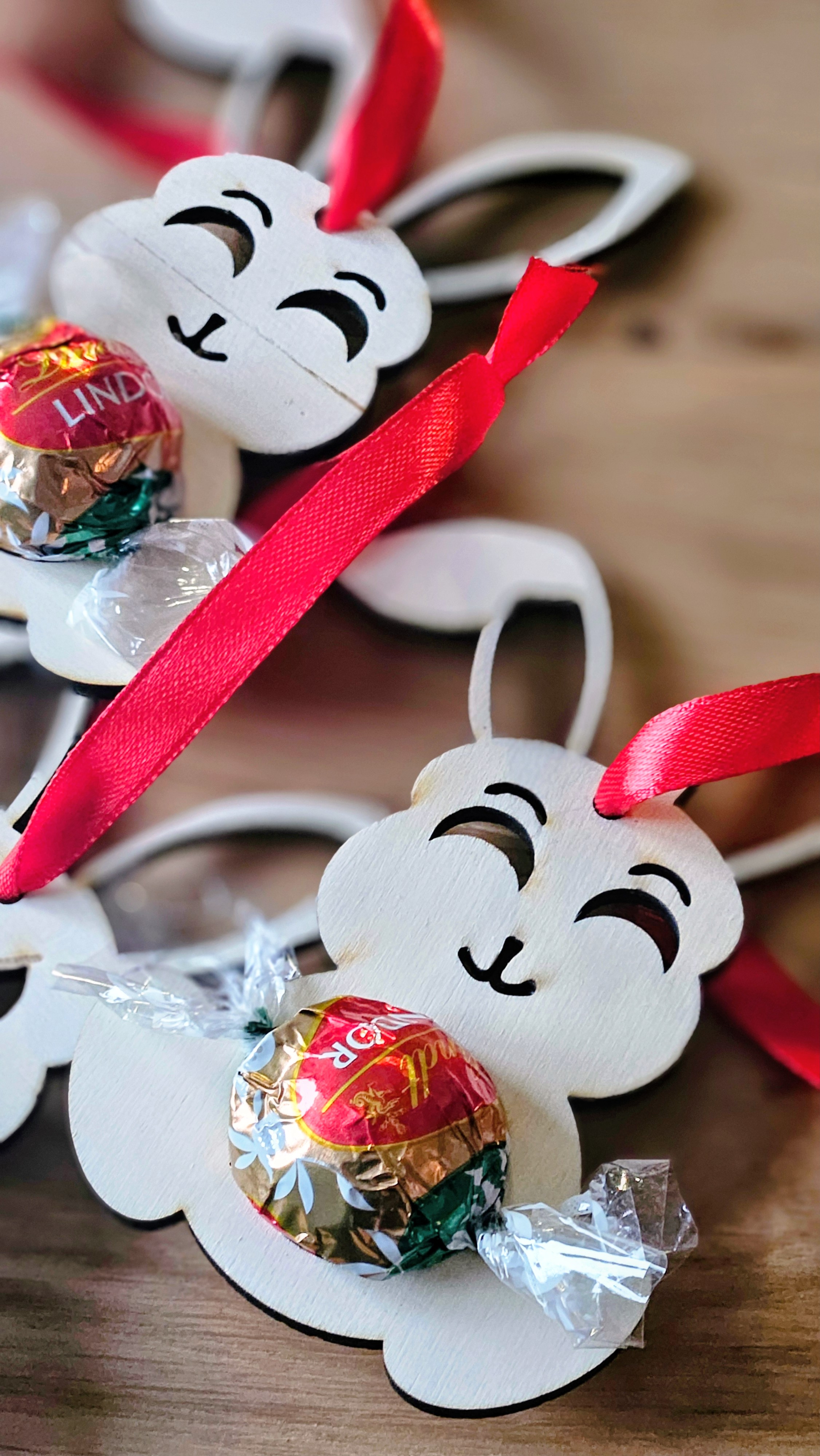 Details: Jeder Hase wird mit einem passenden roten Band geliefert.