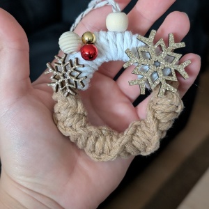 Einzigartiges, handgefertigtes Makramee-Ornament in Naturweiß und Jute. Verziert mit zwei großen, glitzernden, goldenen Schneeflocken und festlichen Kugeln. Perfekt als Baumschmuck oder Geschenk.