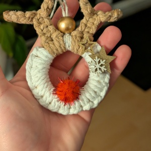 Das süßeste Geschenk der Saison! Handgefertigtes Rentier-Ornament in Makramee-Technik mit Geweih und einer witzigen roten Pom-Pom-Nase. Ideal als Christbaumschmuck oder Mitbringsel.