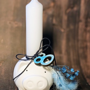 Geschenkset mit Stabkerze in Marmoroptik sowie Kerzenhalter und Deko Häuschen aus Gießpulver in Holzbox; Stabkerze ca. 18 x 2,15cm, Kerzenhalter ca. 4cm Durchmesser, 2,3cm hoch, Häuschen ca. 6,5 x 3,5 x 1,7cm, Holzbox ca. 16 x 9 x 2,2cm