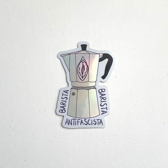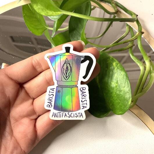 Glänzender Widerstand: Verleihe deinen persönlichen Gegenständen mit dem einzigartigen holografischen Barista Vulva Aufkleber eine politische Note! Das Design verbindet die Barista-Kultur mit körperpositiver Symbolik und schafft so ein lebendiges Emblem für deinen Laptop, deine Wasserflasche, dein Tagebuch oder dein Kaffeezubehör. Das schillernde holografische Material wechselt je nach Lichteinfall die Farbe und erinnert daran, dass Stärke und Schönheit viele Formen annehmen können. Es ist mehr als nur ein Aufkleber, es ist ein mutiges Statement. In einer Welt, in der das Patriarchat versucht, unsere Körper zu kontrollieren, unsere Stimmen zum Schweigen zu bringen und unsere Identitäten zu diktieren, entscheiden wir uns für Stolz und Sichtbarkeit. Lasst uns für das Recht auf körperliche Autonomie, Selbstbestimmung und die Kraft der Gemeinschaft kämpfen. Für die Baristas, Aktivisten, Queer-Community, Feminist*innen und alle Verbündeten. Der Holo Barista Vulva-Aufkleber ist ideal für den persönlichen Gebrauch oder als individuelles Geschenk und wird definitiv Blicke auf sich ziehen und zu wichtigen Gesprächen anregen.