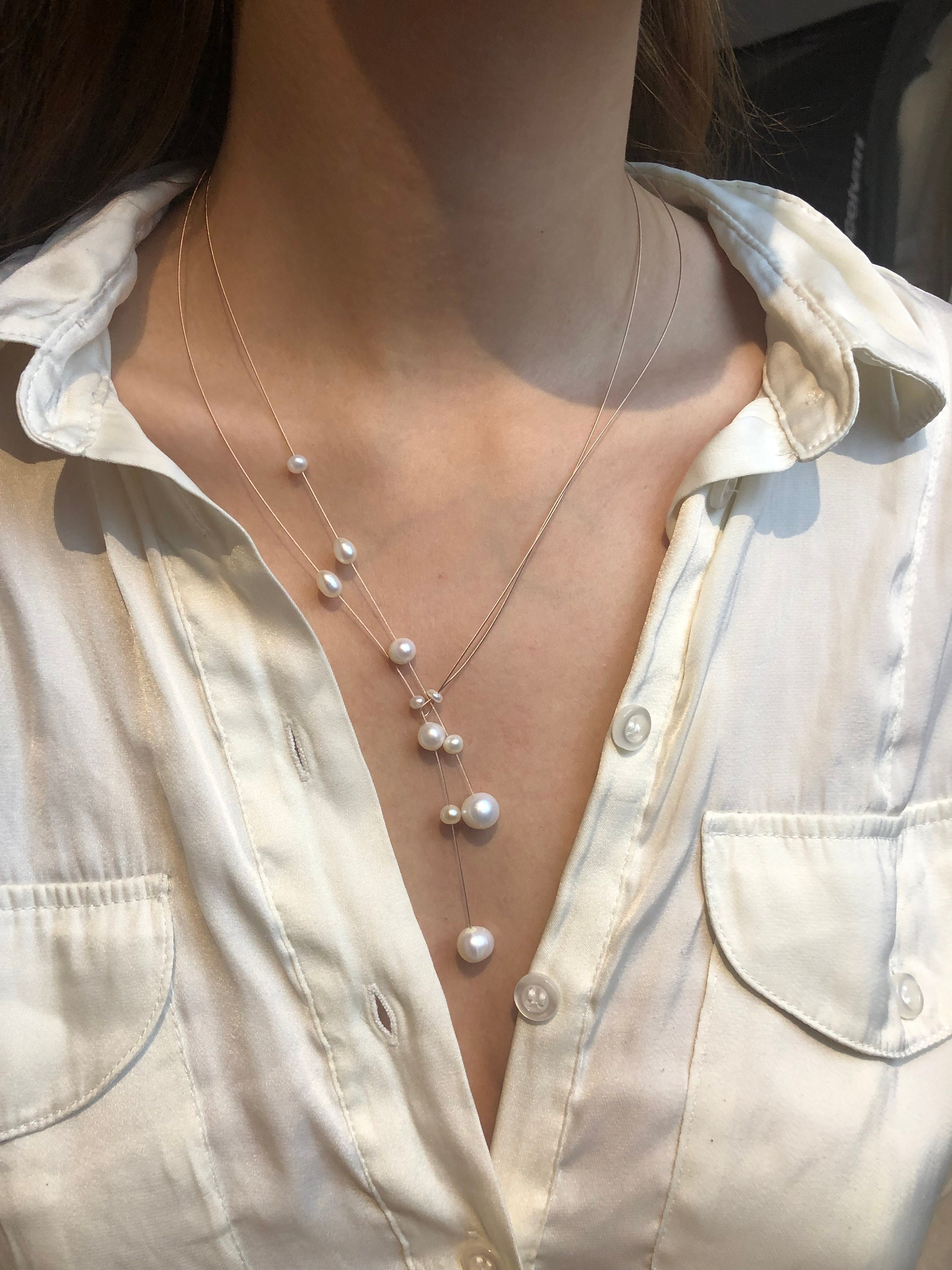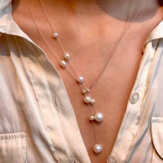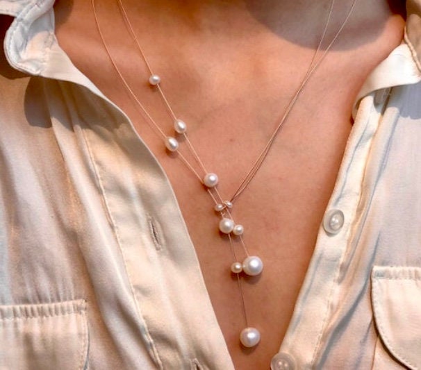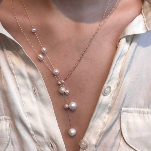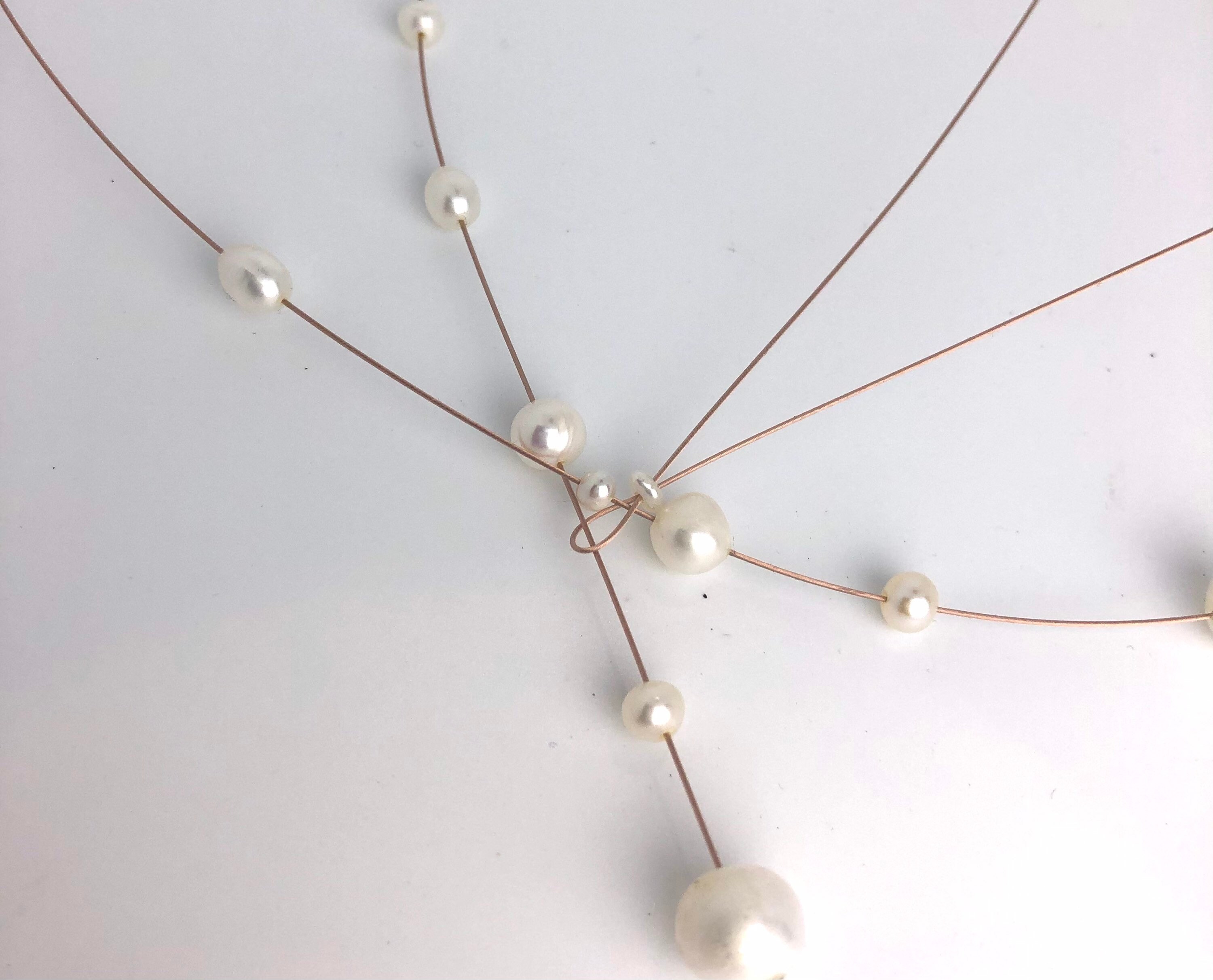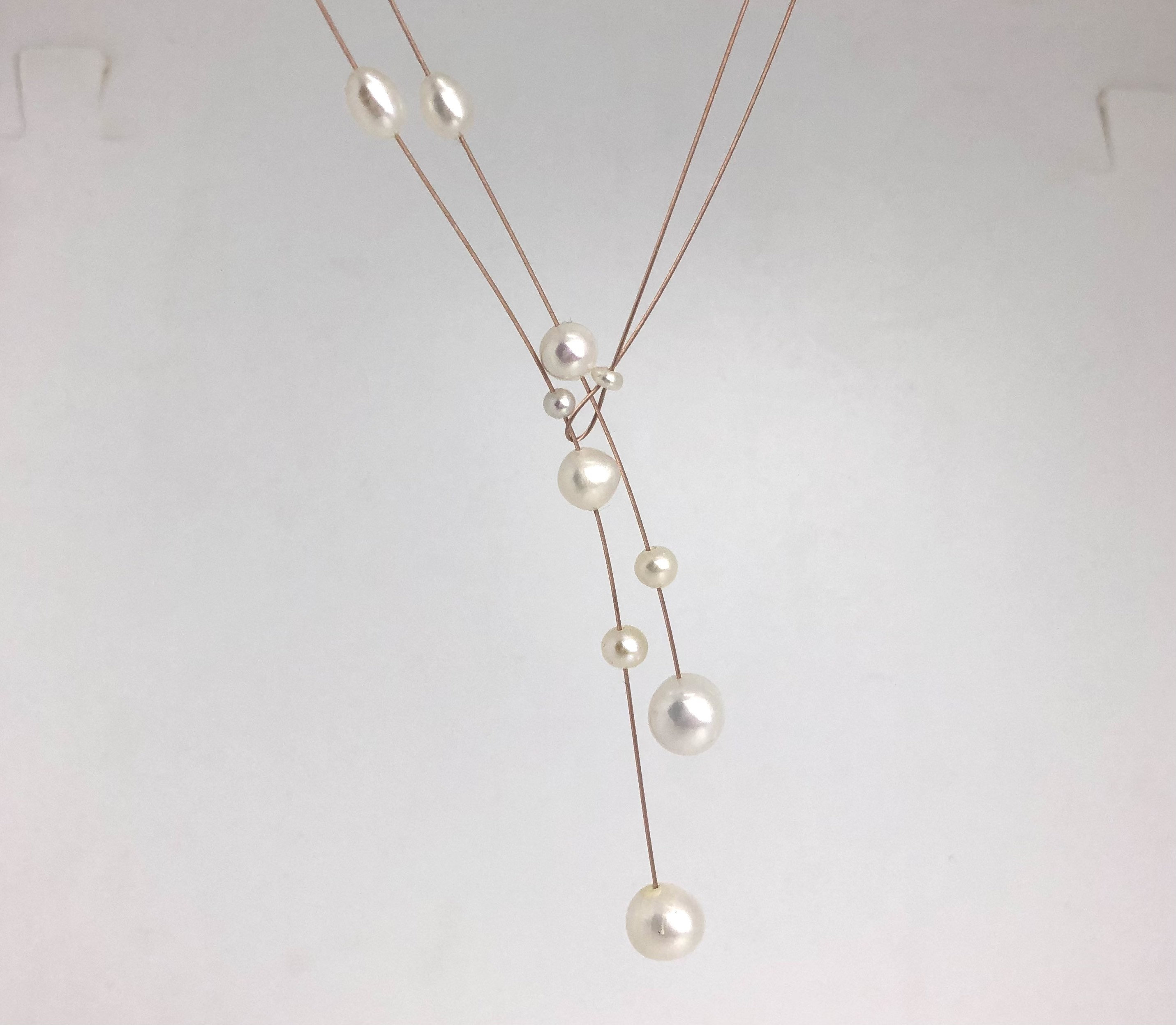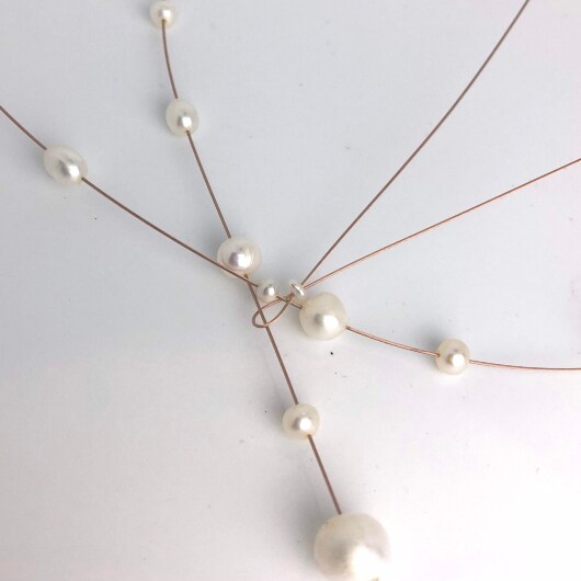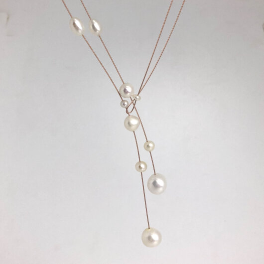Handgefertigte Süsswasser Perlenkette auf rose´Gold Seil. Dieses Collier ist perfekt für Dein Hochzeitsoutfit. Auch im Alltag ist diese Kette sehr gut tragbar. Sie macht aus Deinem Outfit etwas Besonderes. Dieses Collier trägst Du, und durch die spezielle Form betonst Du Deinen Ausschnitt.