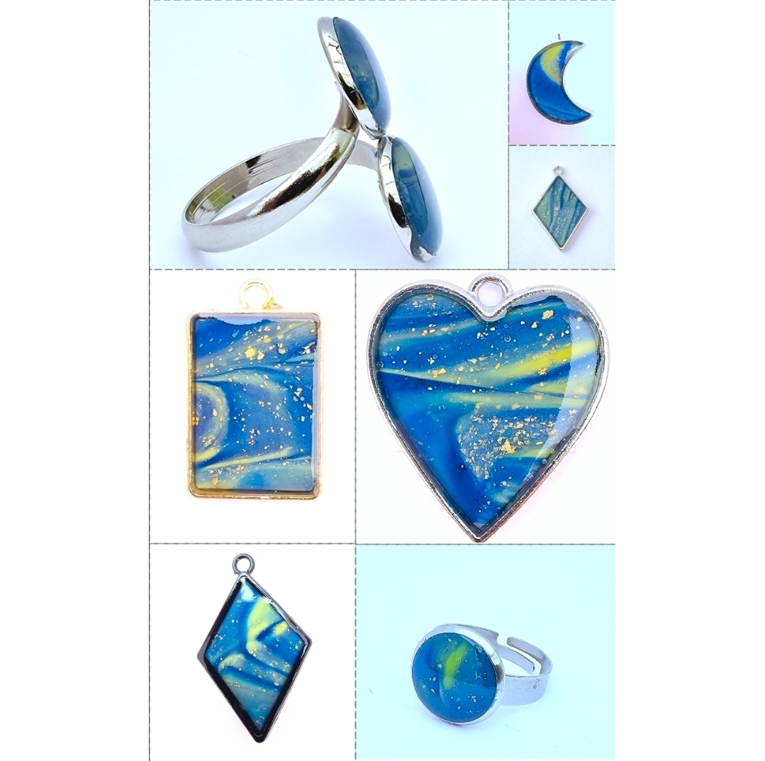 Серьги, подвески и кольца из полимерной глины, запечатанные УФ-смолой различных цветов и форм.
