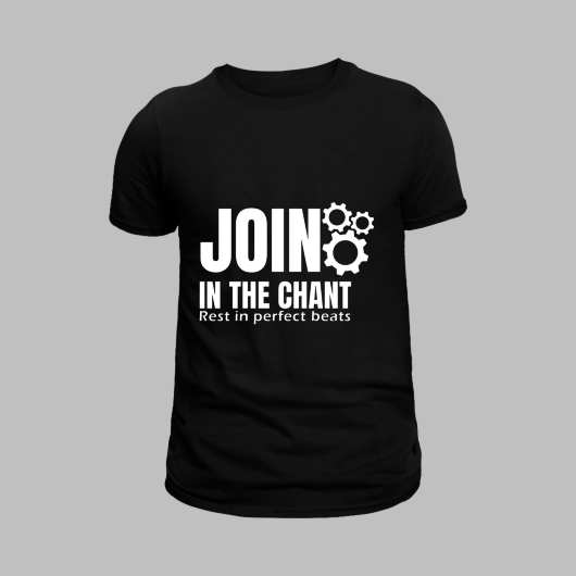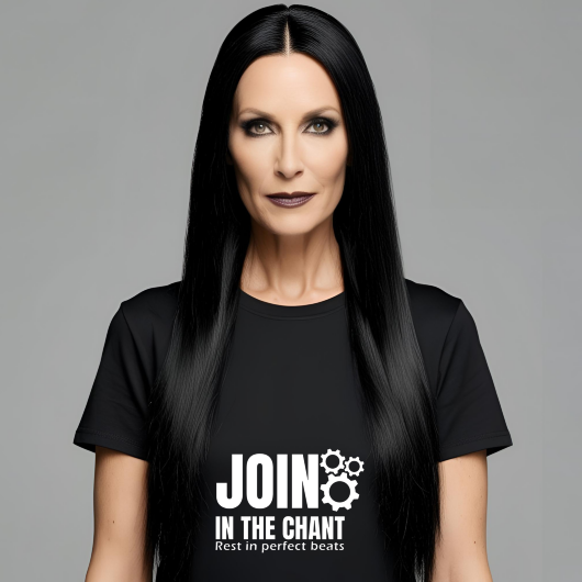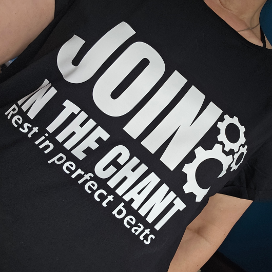 Das Shirt trägt die Worte „Join in the Chant“ – ein Satz, der für mich mehr ist als nur ein Songtitel. Er steht für ein Lebensgefühl, das mit Industrial, EBM und der schwarzen Szene verbunden ist. Drei Zahnräder symbolisieren für mich die rohe, mechanische Kraft seiner Musik – schlicht, aber wirkungsvoll.