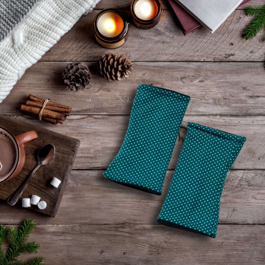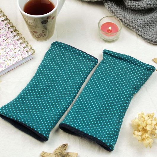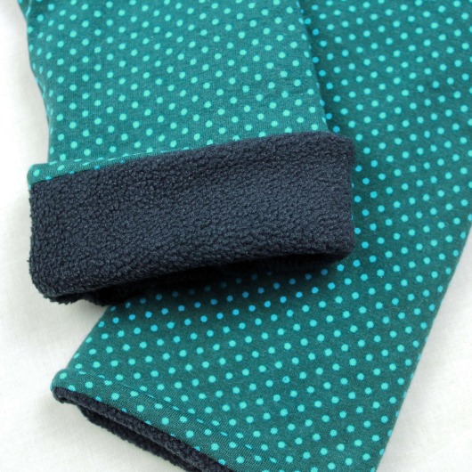 Die Handstulpen werden sorgfältig von Hand genäht. Außen besteht der Stoff aus petrolfarbenem Jersey mit kleinen hellblauen Punkten, innen aus weichem, dunkelblauem Fleece. Das Futter sorgt für Wärme, der elastische Stoff für einen angenehmen Sitz. Durch den Schnitt ohne Daumenloch bleiben deine Hände flexibel – ideal für den Alltag.