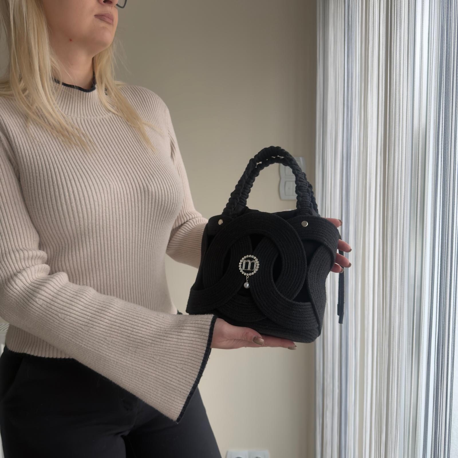 Setzen Sie auf zeitlose Eleganz mit dieser handgefertigten Designer-Tasche in klassischem Schwarz. Das Modell in Größe S besticht durch seine kompakte Form und die kunstvolle, dreidimensionale Flechtstruktur, die in aufwendiger Handarbeit gefertigt wurde.