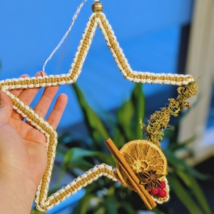 Suchst du nach etwas Besonderem? Dieser handgearbeitete Stern ist ein echtes Makramee-Highlight! Er kombiniert gemütliche, geflochtene Schnüre mit Natur-Deko (Orange, Zimt, Anis). Perfekt als Fensterdeko oder festliches Wand-Statement.