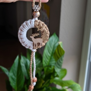 Du liebst den skandinavischen Look ? Dann ist dieser Ring perfekt für dich! Er ist in liebevoller Makramee-Handarbeit gefertigt und zeigt ein süßes Rentier im Wald aus Holz-Deko. Ein wunderschönes Statement-Piece für dein Fenster!
