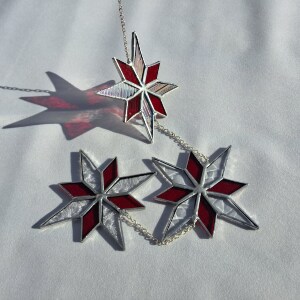 Handgefertigte Glasdekoration, gefertigt in Tiffany-Technik. Drei rote Glassterne sind durch eine feine Metallkette miteinander verbunden, die dem Stück Leichtigkeit und Eleganz verleiht. Die Kombination aus sattem Rot und klarem, strukturiertem Glas entfaltet ihre volle Schönheit im direkten...