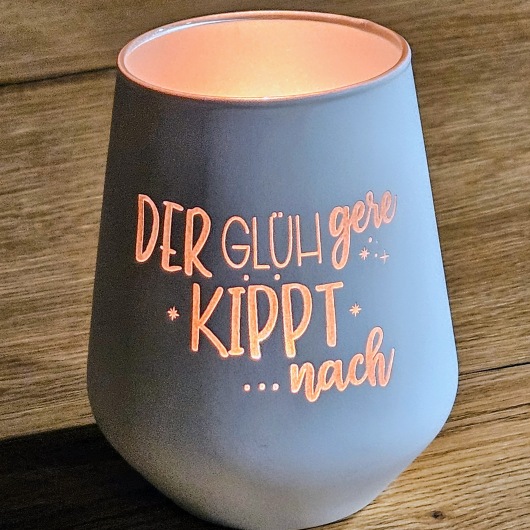 Один стакан – два применения! Это элегантное изделие можно использовать и как классический бокал для питья для уютных вечеров глинтвейна, и как атмосферный фонарь. Особенность: на каждом бокале выгравирована волшебная надпись глинтвейна. Могут наступать зимние вечера. Кроме того, он предлагает возможность добавления персональной гравировки, что делает каждое стекло уникальным. Идеально подходит в качестве подарка или для собственной коллекции, он гарантированно привнесет теплый свет в темные зимние дни.