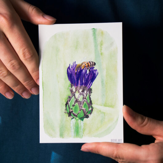 Genießen Sie die Schönheit der Natur mit dieser Postkarte von einer Biene, die eine Kornblume bestäubt.