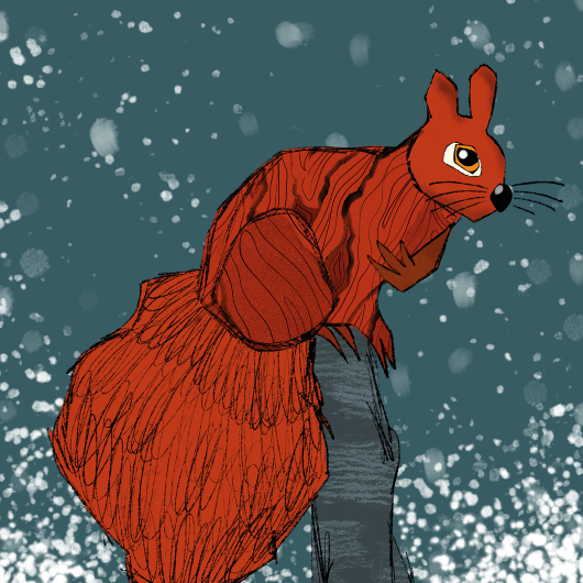 Digital erstellte Illustration einer Tierfigur - in diesem Fall ein Eichhörnchen im Schneegestöber.